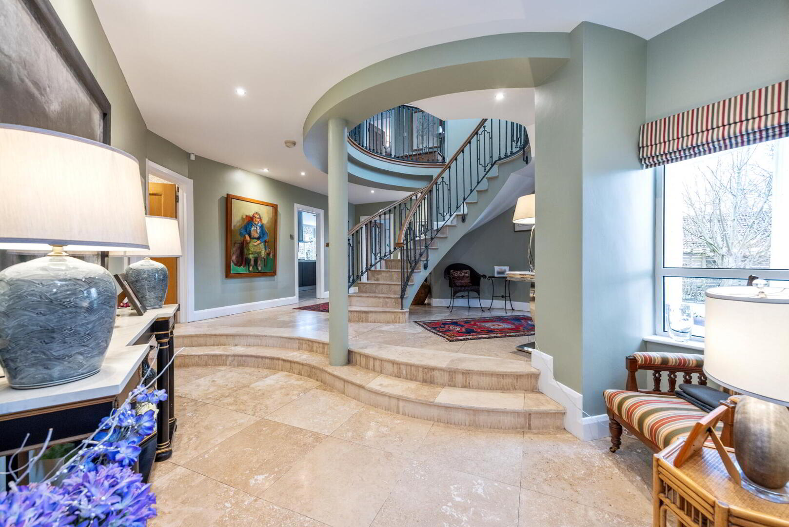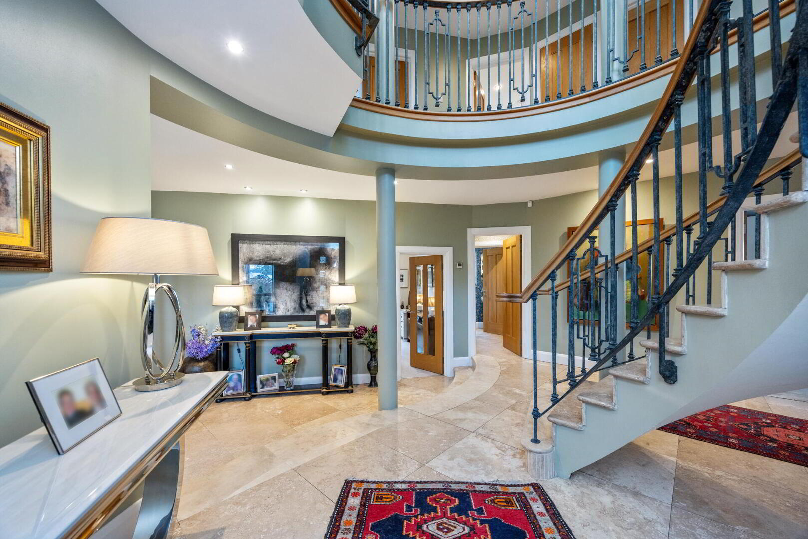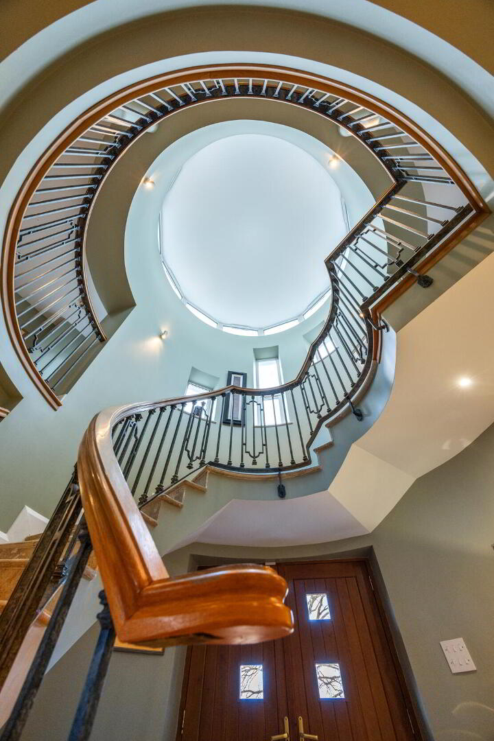 RECEPTION HALL Ornate winding staircase leading to first floor, marble tiled floor, recessed low voltage spotlights, feature vaulted ceiling with skylight.
