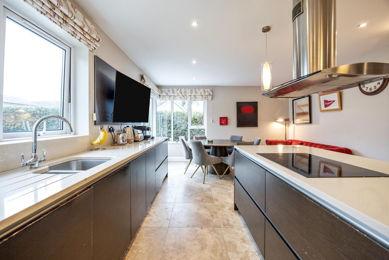 OPEN PLAN KITCHEN / LIVING / DINING AREA 22' 3" x 13' 10" (6.8m x 4.22m) Range of fitted high and low level contemporary units with Corian work surfaces and matching upstand, 1.5 bowl single drainer stainless steel sink unit with mixer taps, integrated Smeg oven, integrated dishwasher, island unit with electric hob, De Dietrich extractor fan, marble tiled floor, recessed low voltage spotlights, feature corner window, feature wine rack, hidden plug socket totem.