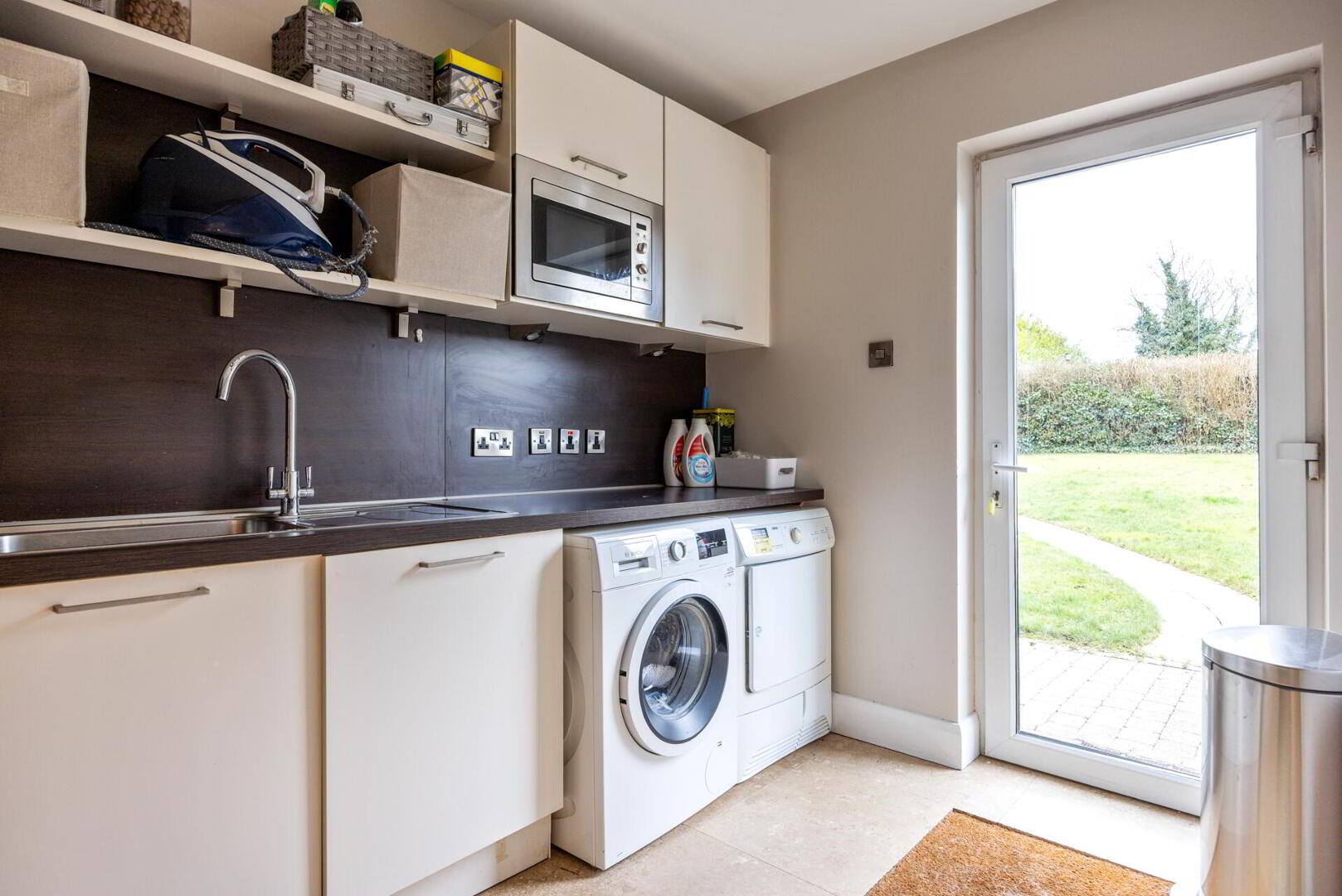 UTILITY ROOM 11' 11" x 6' 10" (3.65m x 2.1m) Range of fitted high and low level units, wood effect work surfaces and matching upstand, plumbed for washing machine, marble tiled floor, built in storage cupboard (suitable as cloaks space), single drainer stainless steel sink unit with mixer taps, door to rear garden.
