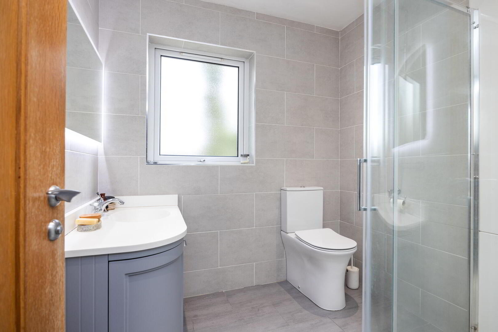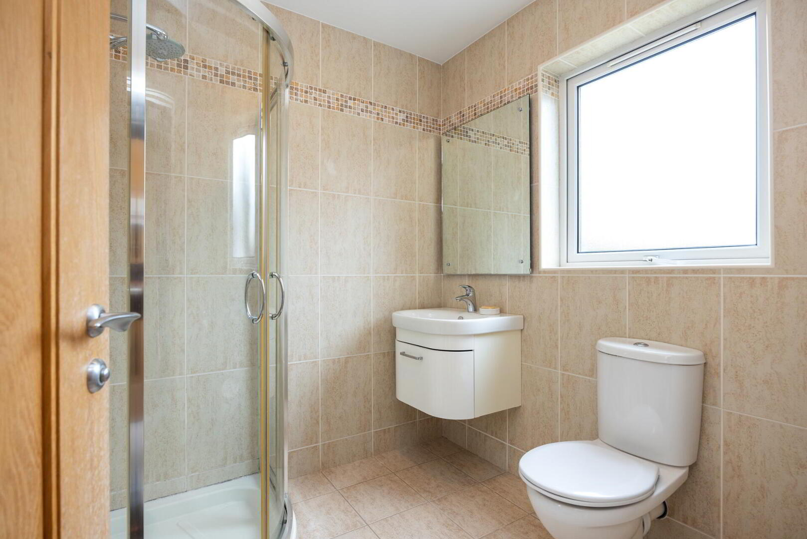 ENSUITE Enclosed shower cubicle, vanity wash hand basin, low flush WC, tiled walls, tiled floor, extractor fan.