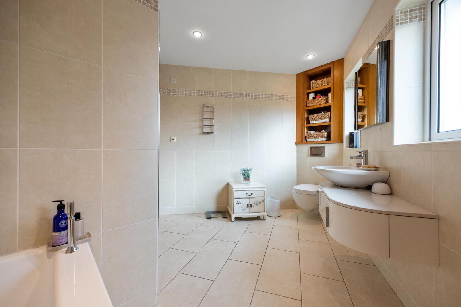 BATHROOM Panelled bath with hand shower, vanity wash hand basin, low flush WC with concealed cistern, feature mirror with light, feature display shelving, tiled walls, tiled floor, stainless towel radiator.
