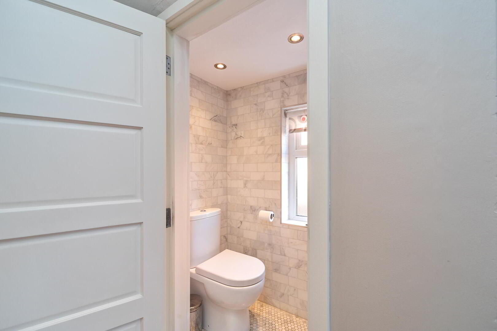 WC / CLOAKROOM Low flush WC, vanity wash hand basin, stainless steel towel radiator, recessed low voltage spotlights.