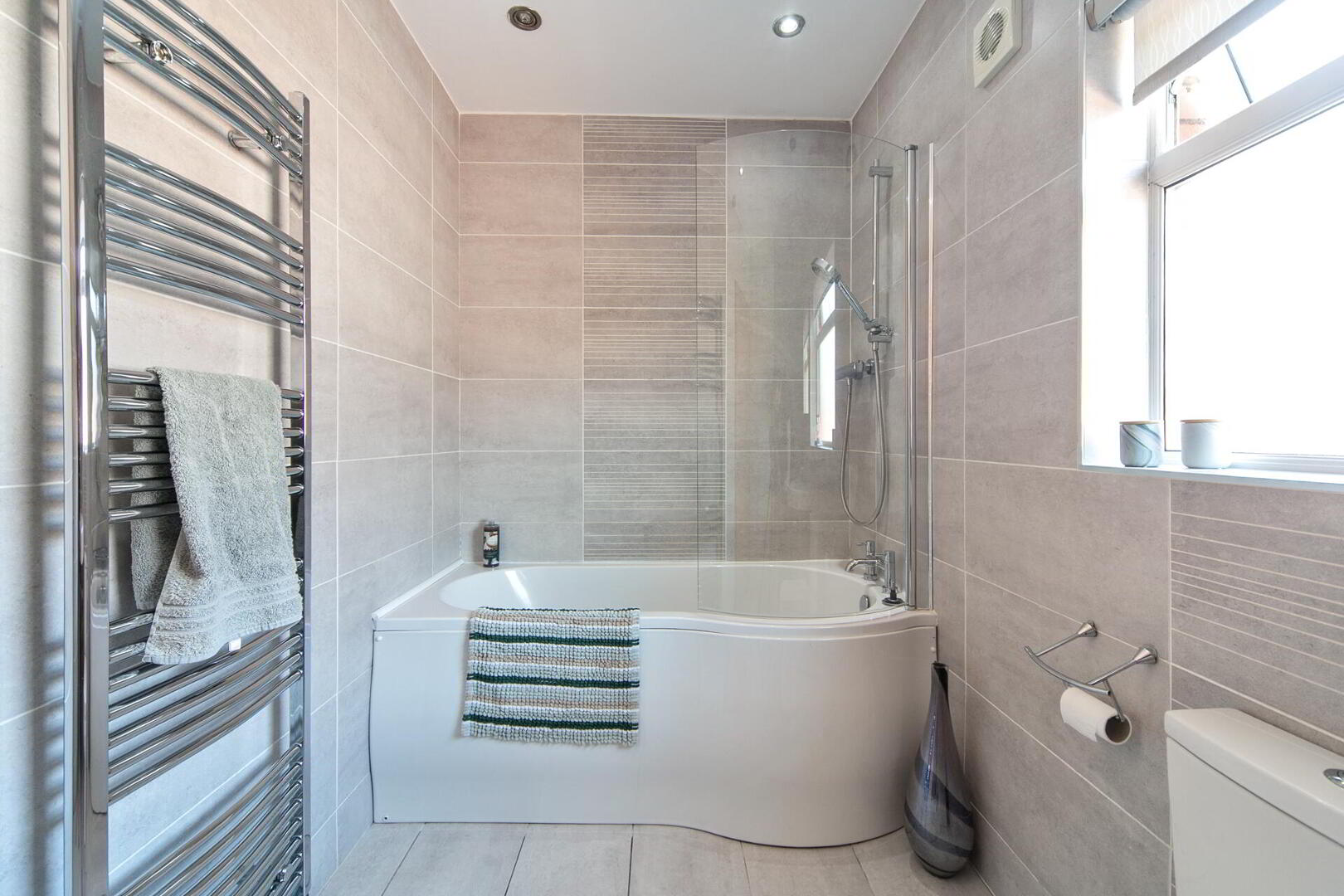 BATHROOM Suite comprising of a panelled bath with shower, low flush WC, vanity wash hand basin, feature mirror, tiled walls, tiled floor, recessed low voltage spotlights, stainless steel towel radiator.