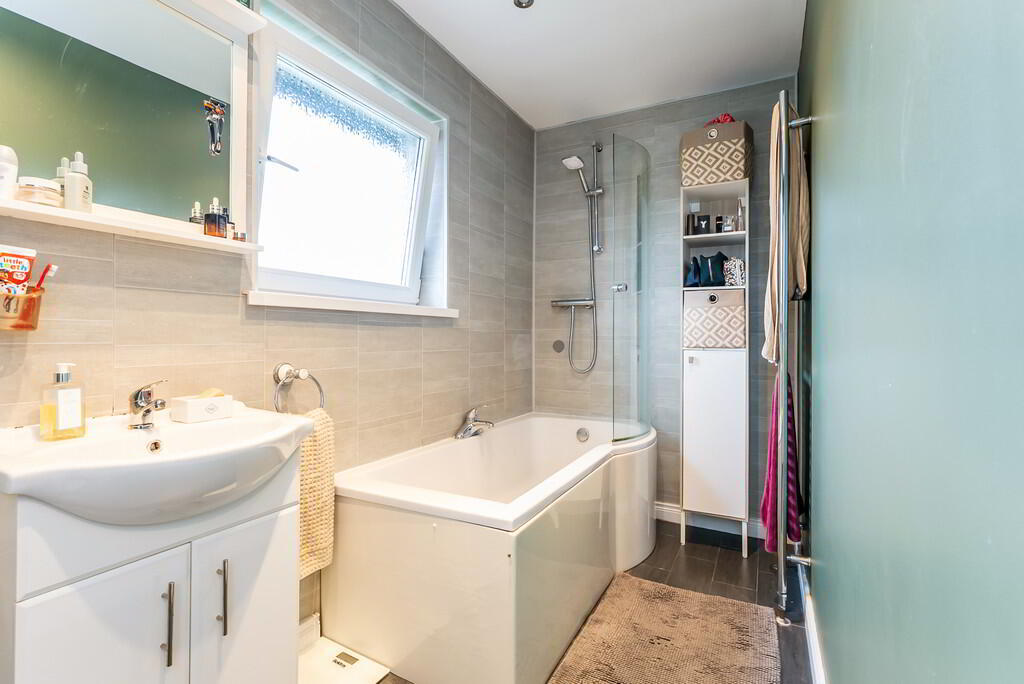 BATHROOM Modern white suite comprising of a curved panel bath with chrome mixer taps, thermostatically controlled shower unit, shower screen, wash hand basin with chrome taps and storage under, low flush w.c, chrome heated towel radiator, spotlighting, multi panelled walls.