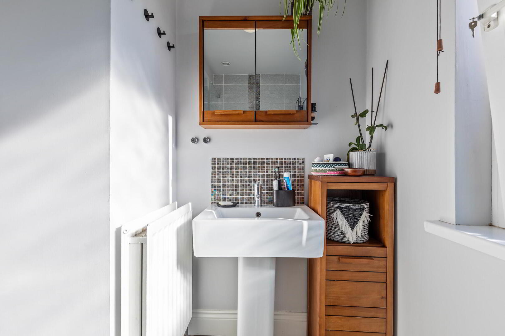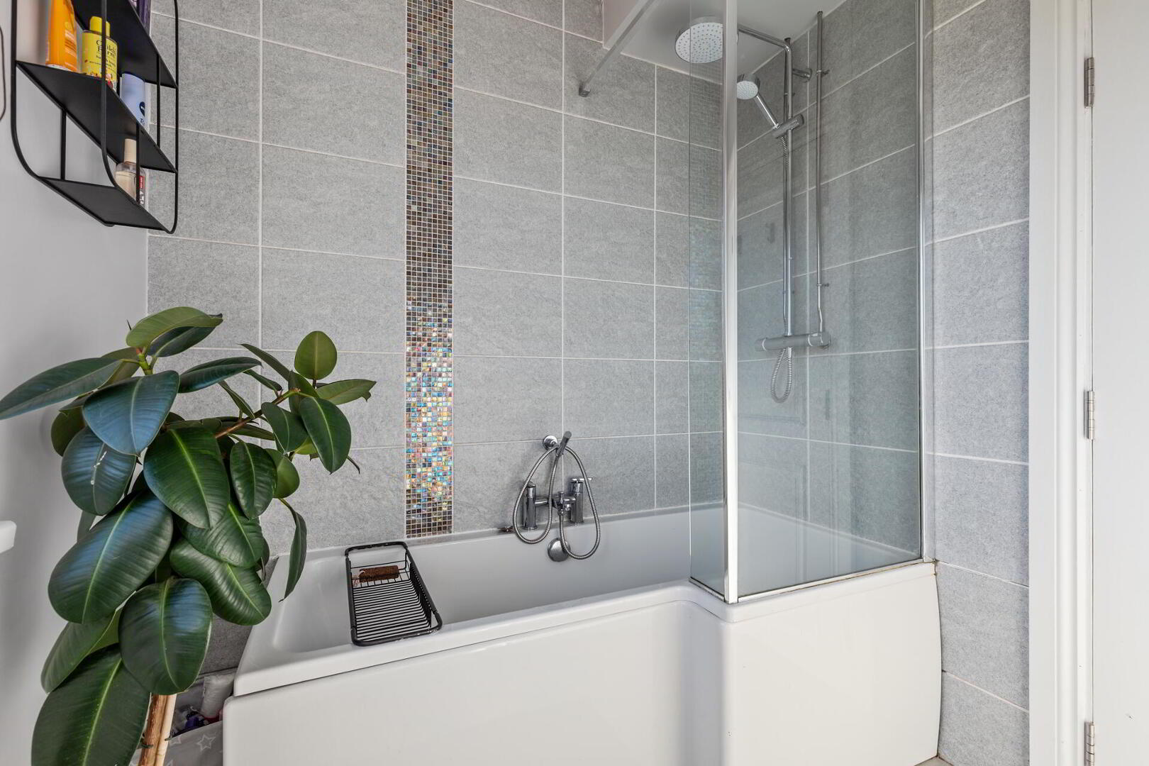 BATHROOM White suite comprising of a panelled bath with chrome taps and drench style shower over, low flush w.c, pedestal wash hand basin with chrome taps and a mosaic tiled splash back, partly tiled walls, tiled floor.