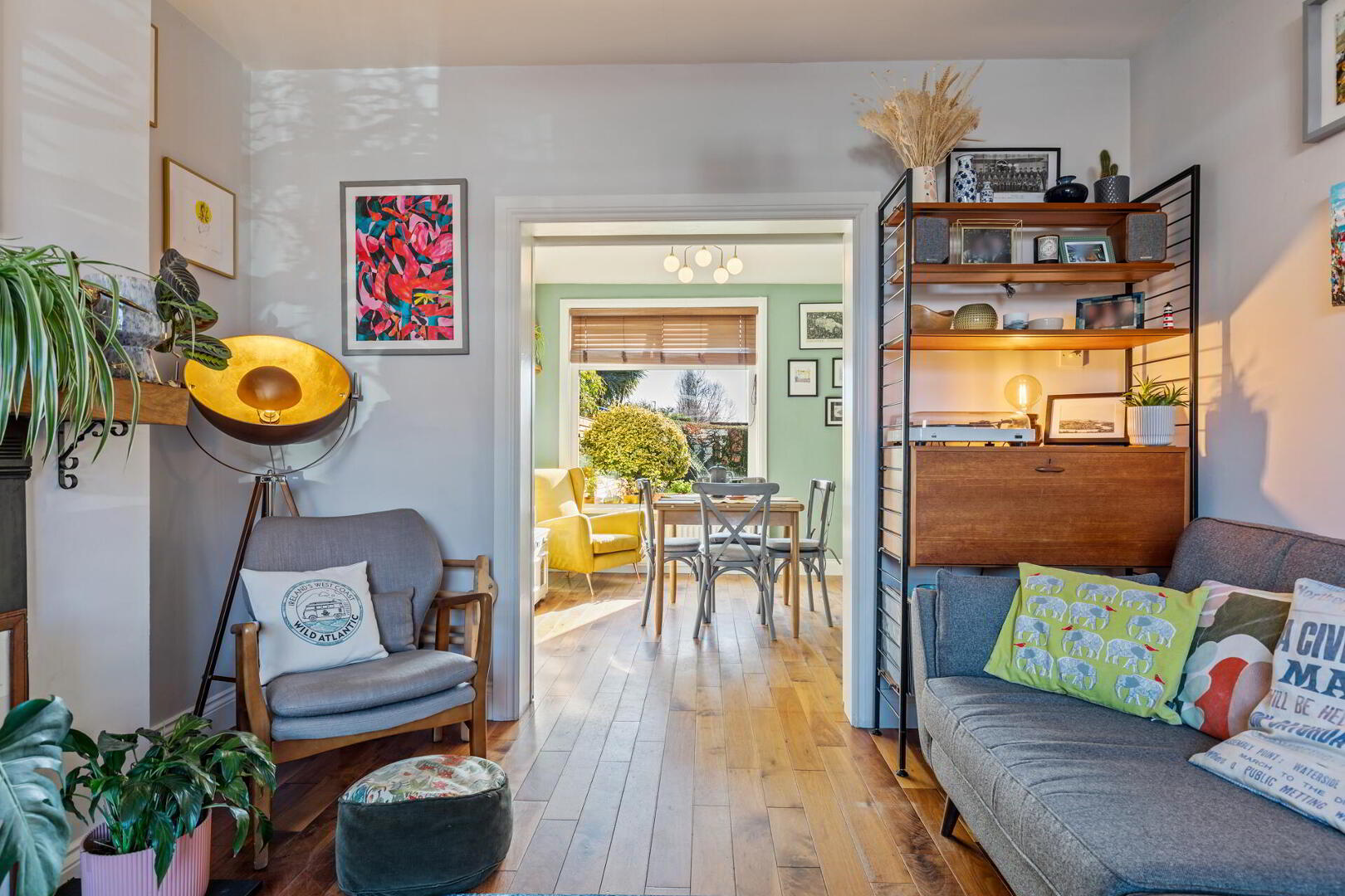 DINING ROOM 11' 9" x 11' 1" (3.60m x 3.40m) Open to kitchen / living room. Solid wooden floor, sliding doors to living room, solid oak display shelving.