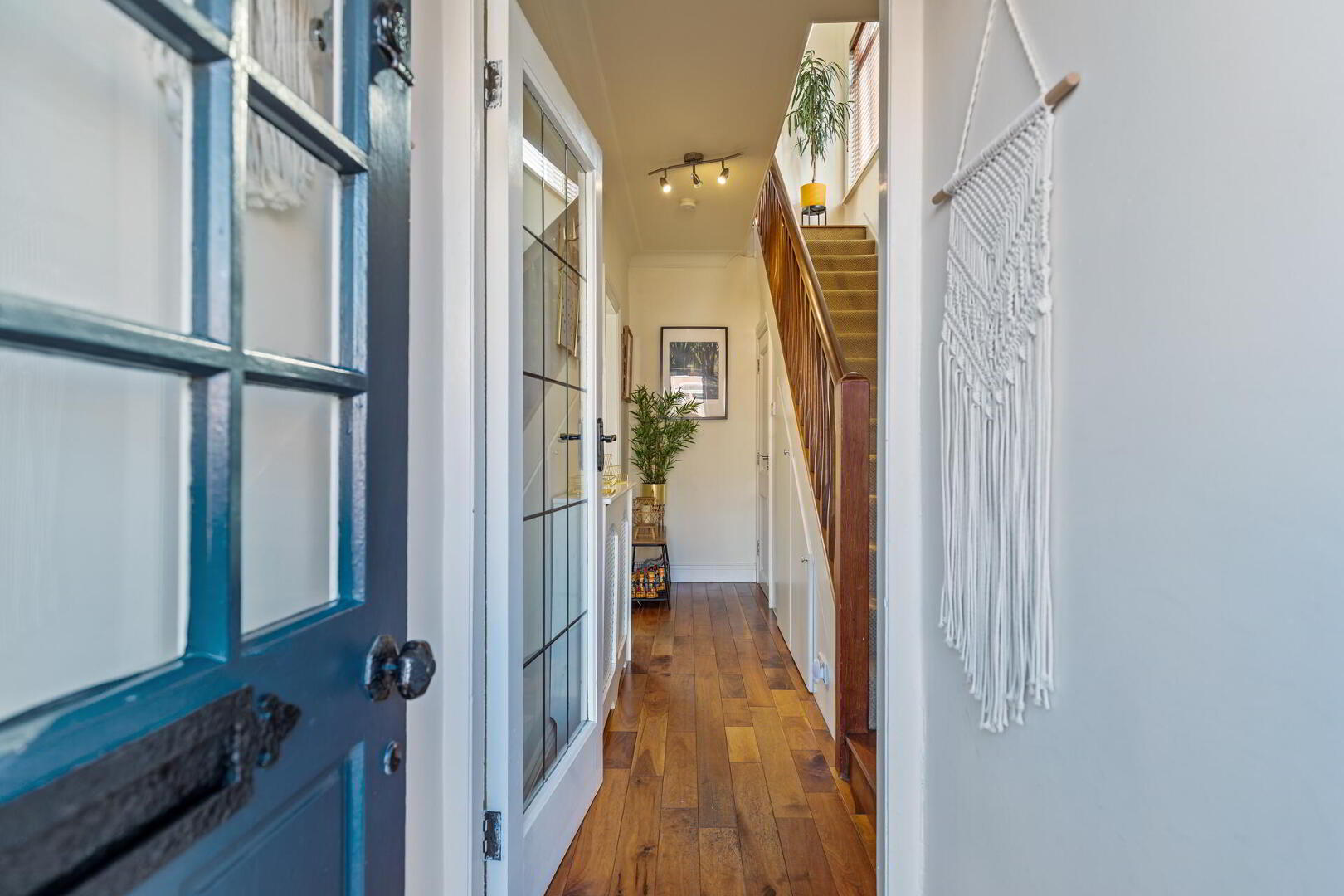 ENTRANCE HALL Solid wooden floor, glazed door, cloak room, under stair storage, cornicing.
