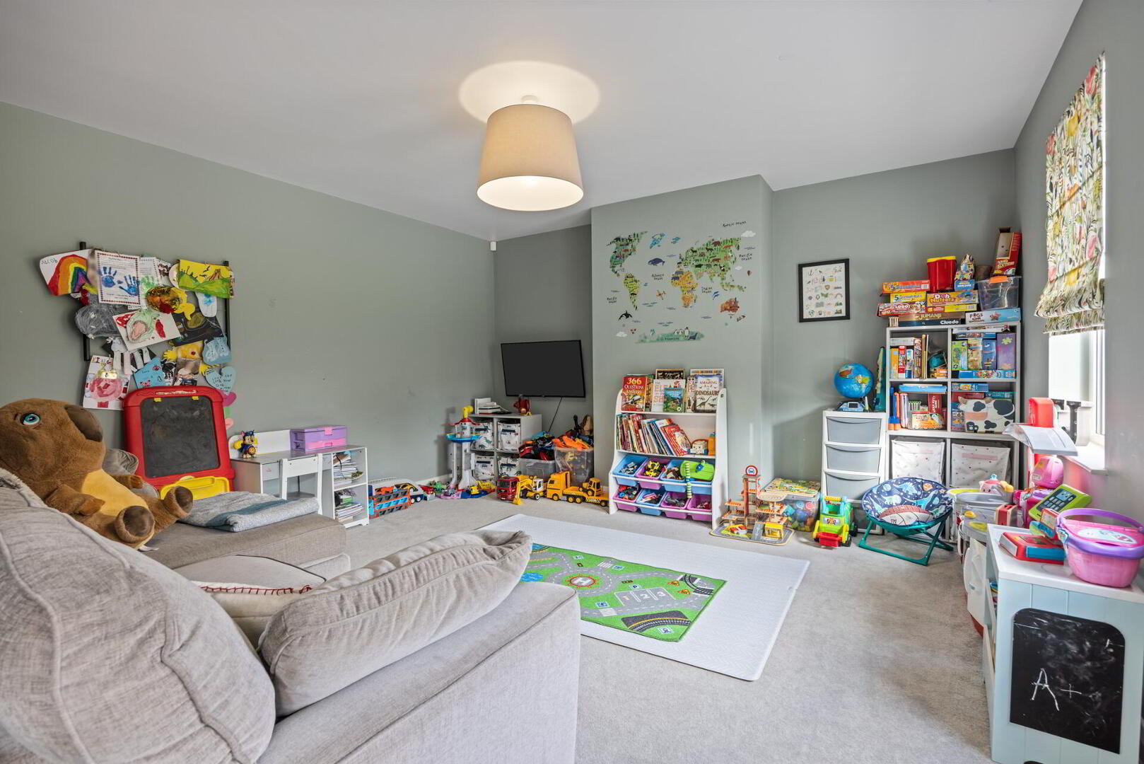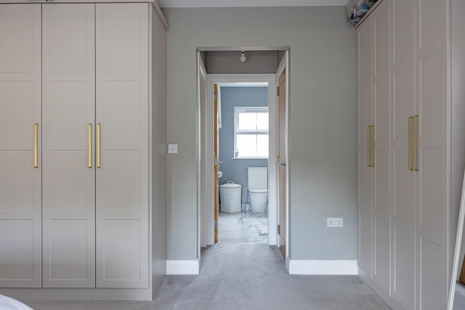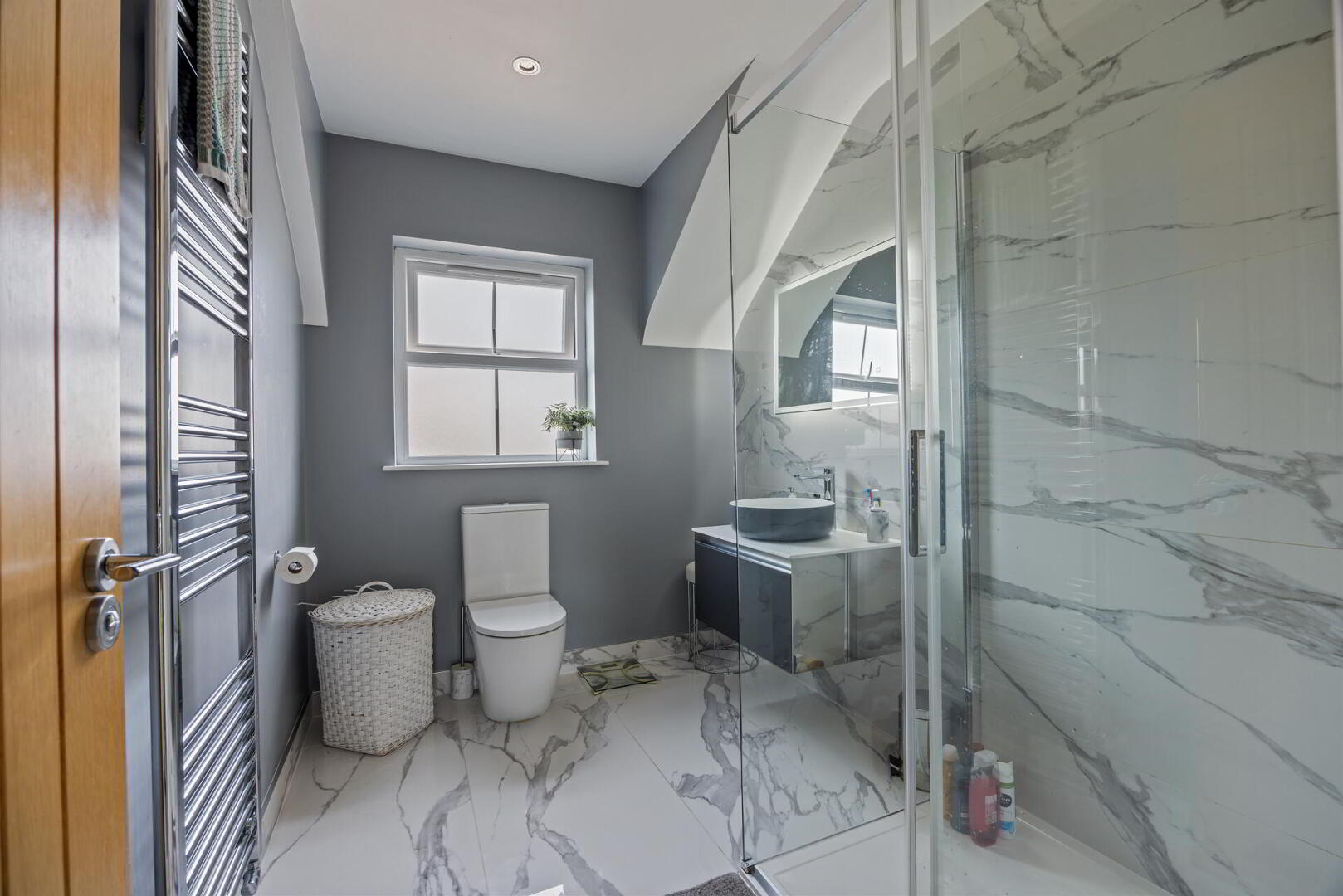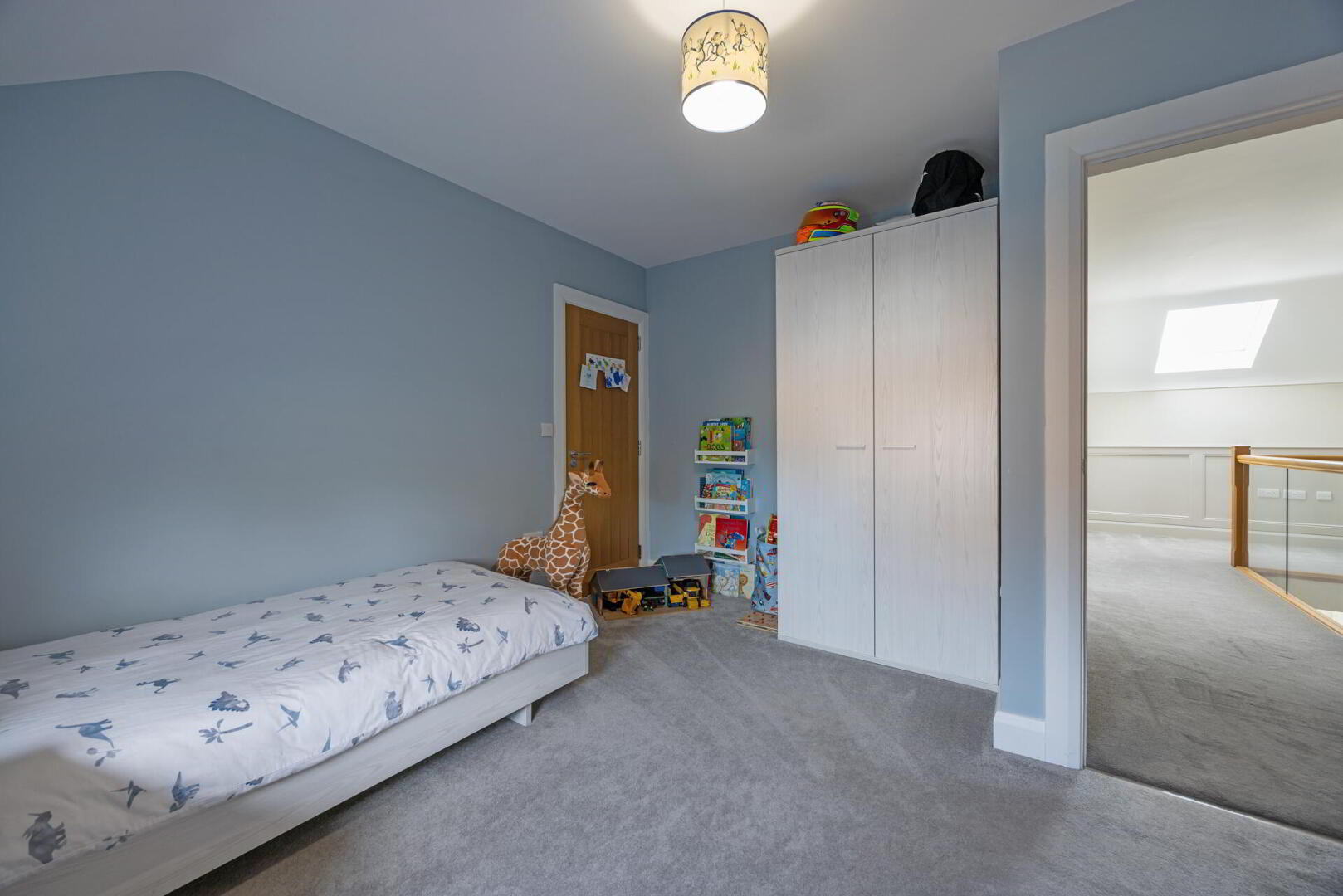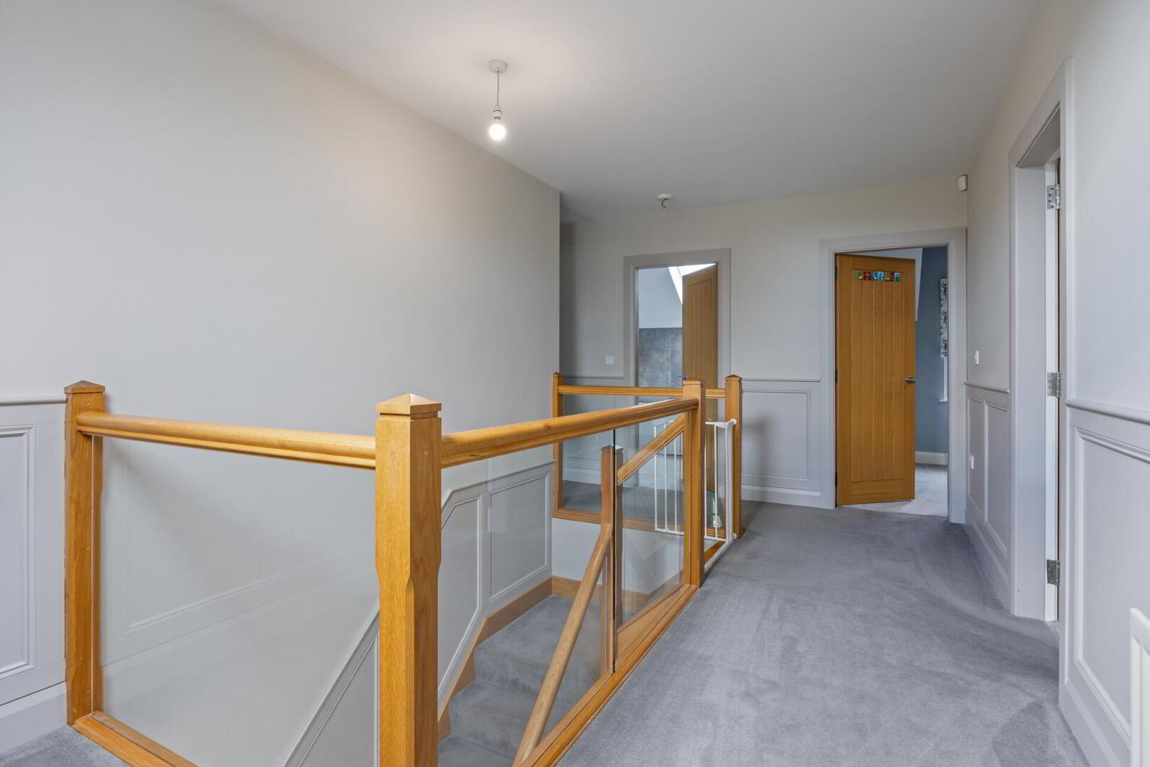 Upstairs comprises four well-proportioned bedrooms. The principal bedroom benefits from an ensuite and built in wardrobes, with a connecting door to the fourth bedroom, making it ideal as a nursery or home office. The generous landing offers additional space for study or seating.