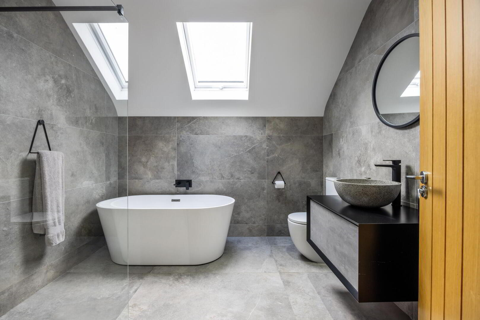 BATHROOM Feature contemporary free standing bath, vanity wash hand basin, low flush WC, walk in shower cubicle, tiled floor, part tiled walls, recessed low voltage spotlights, stainless steel towel radiator.