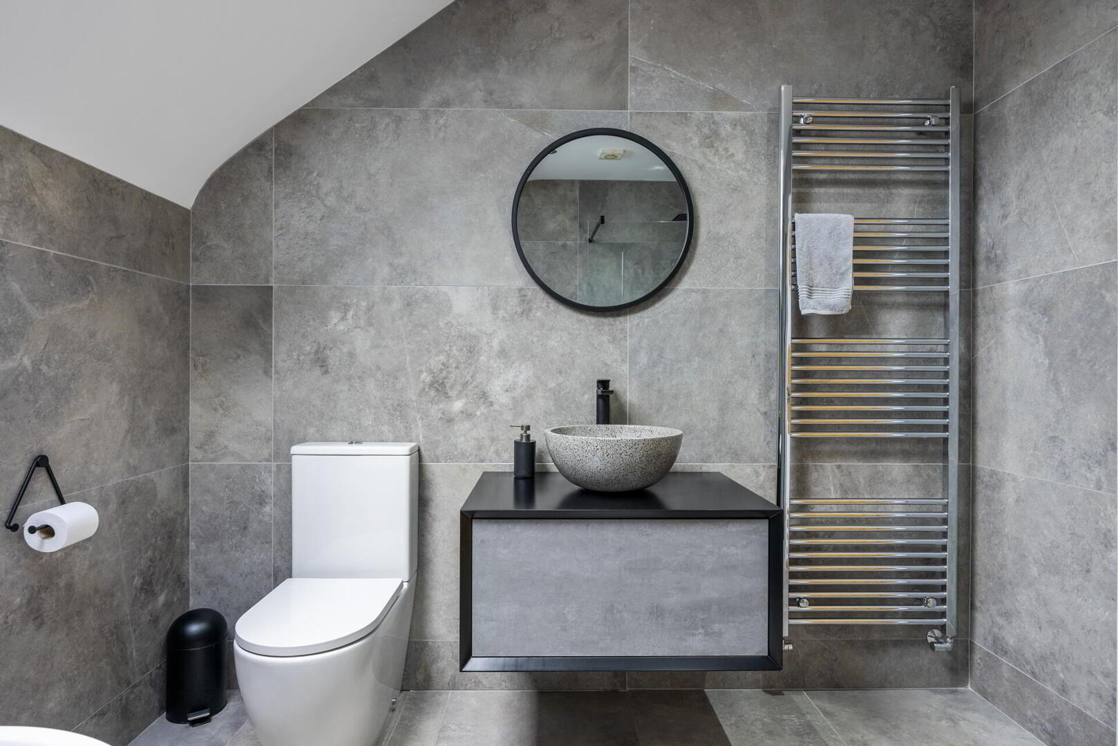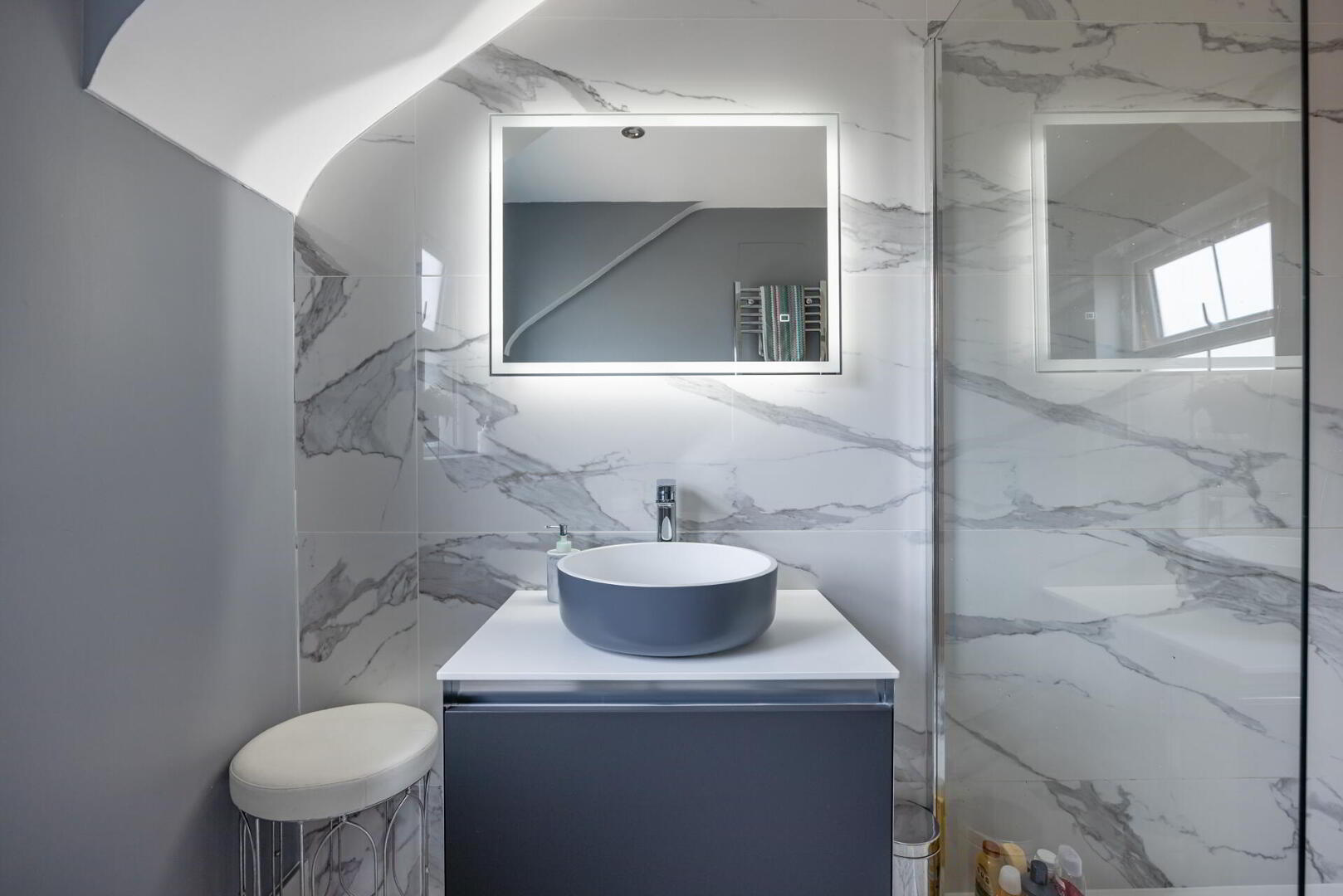 ENSUITE Walk in shower cubicle with Drencher head, low flush WC, vanity wash hand basin, tiled floor, part tiled walls, feature mirror with light, recessed low voltage spotlights, extractor fan, stainless steel towel radiator.