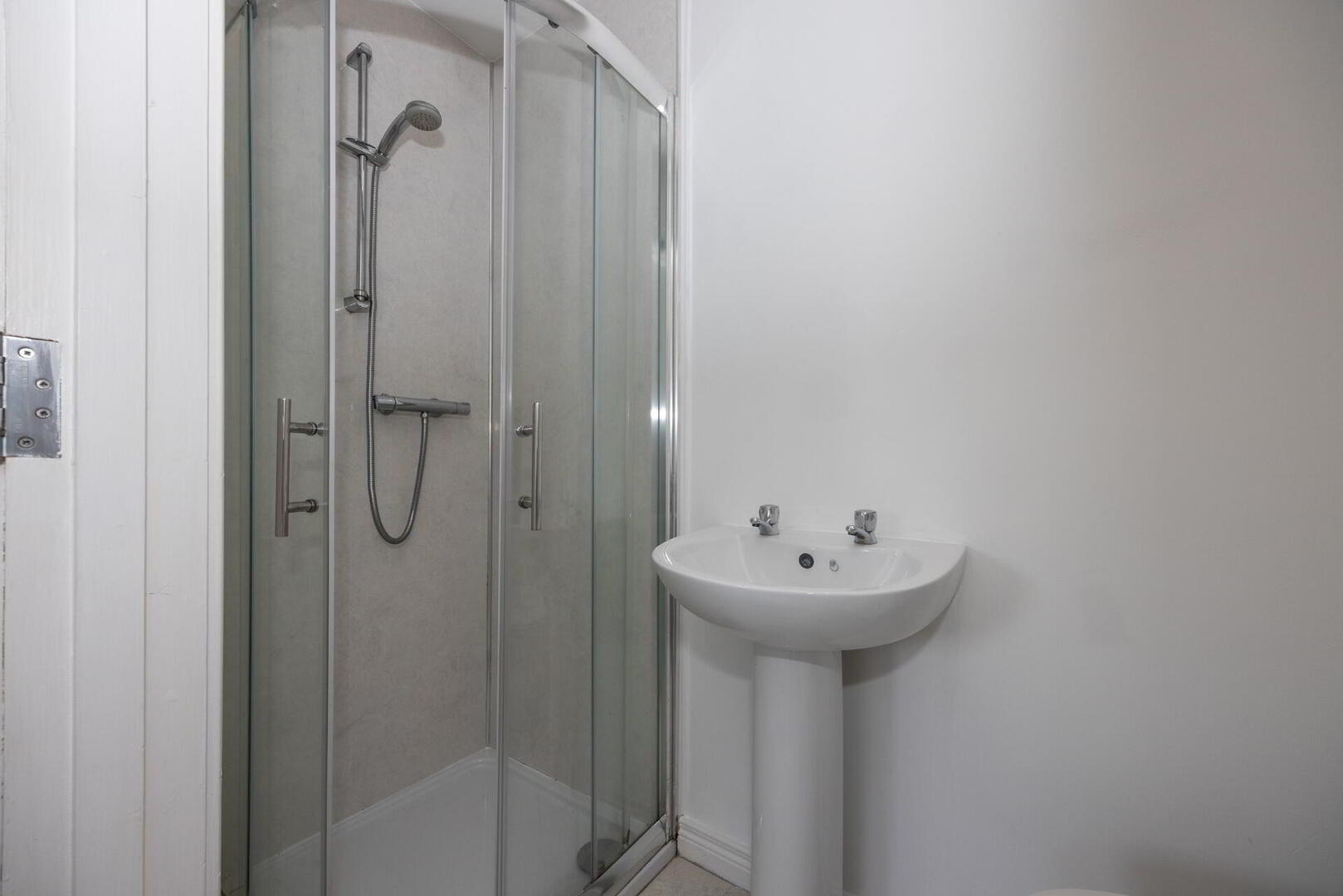 ENSUITE SHOWER ROOM Shower cubicle with chrome taps, pedestal wash hand basin with chrome taps, low flush w.c, heated chrome towel radiator, tiled floor, spot lighting