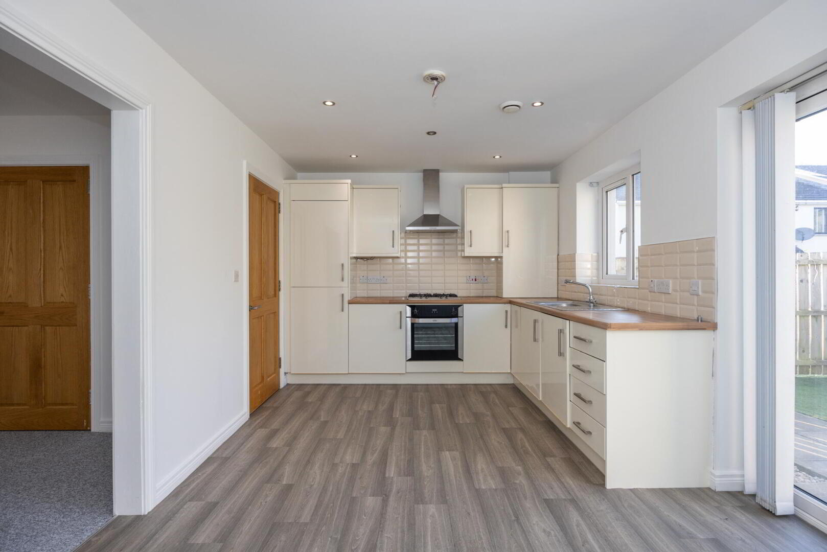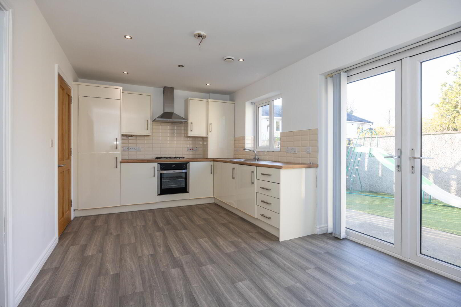 KITCHEN / LIVING / DINING ROOM 17' 8" x 9' 8" (5.39m x 2.96m) Excellent range of high and low level high gloss units with chrome handles, wood effect work surfaces, stainless steel sink unit, integrated oven and four ring gas hob with chrome extractor fan over, integrated fridge freezer, integrated washing machine, partly tiled walls
