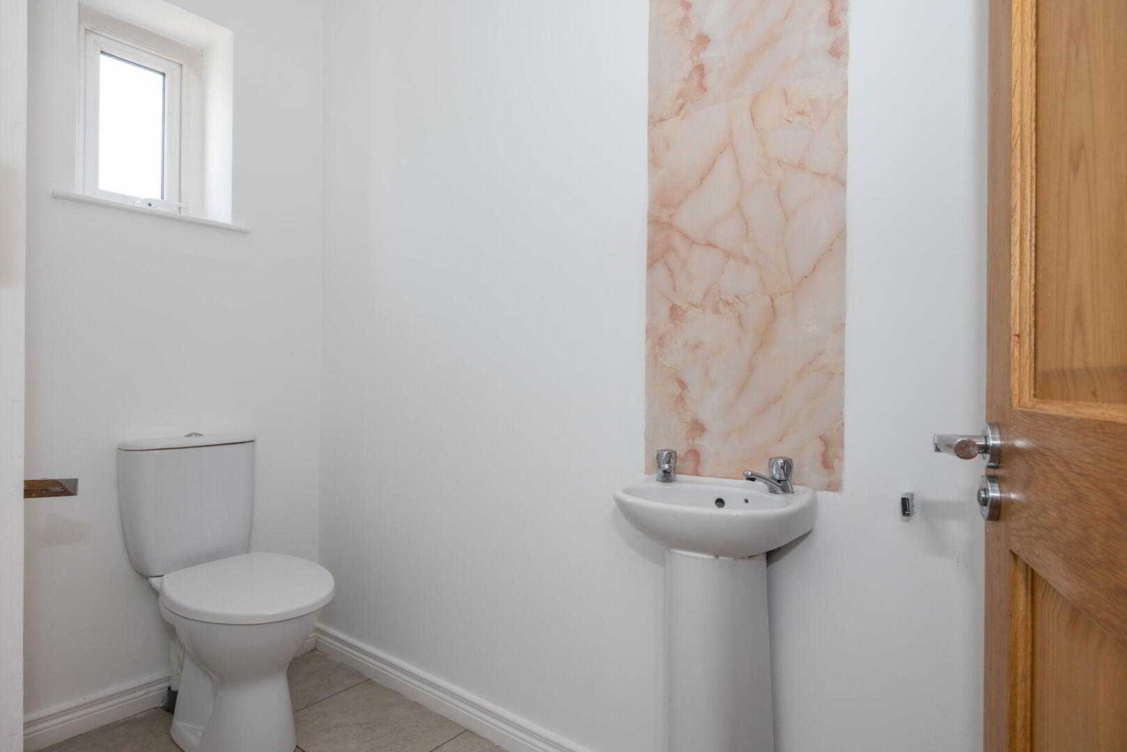 BATHROOM Panel bath with chrome taps, pedestal wash hand basin with chrome taps and tiled splash back, low flush w.c, tiled floor, partly tiled walls, spot lighting