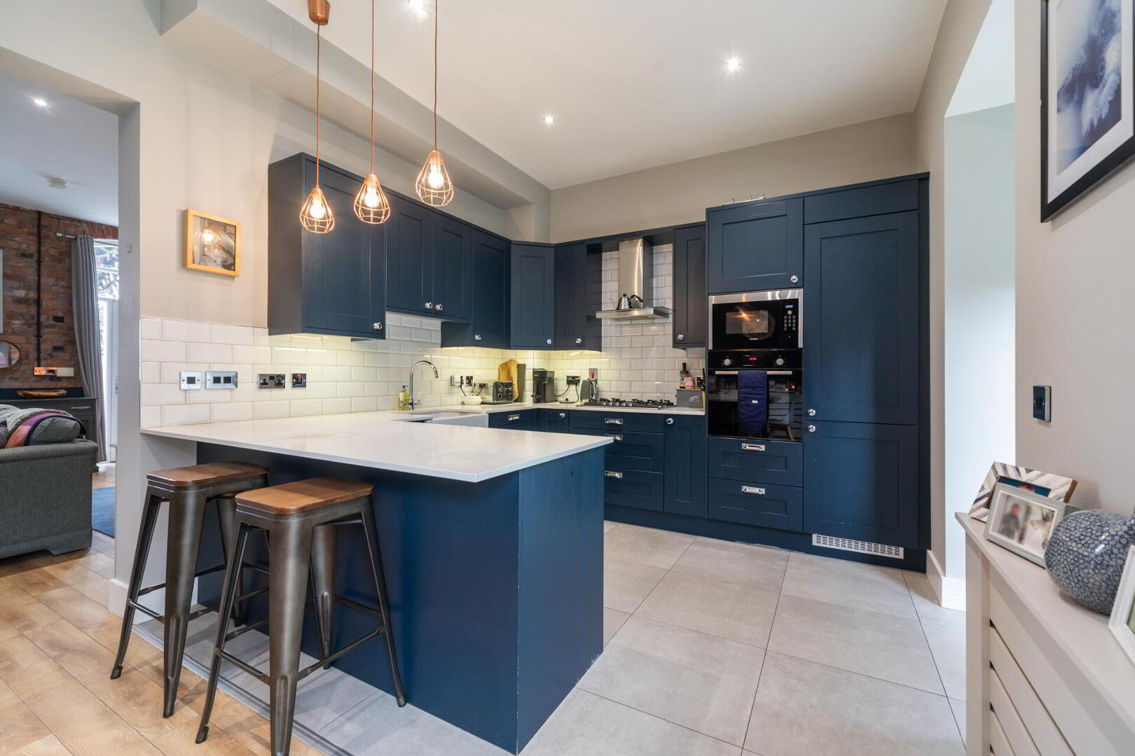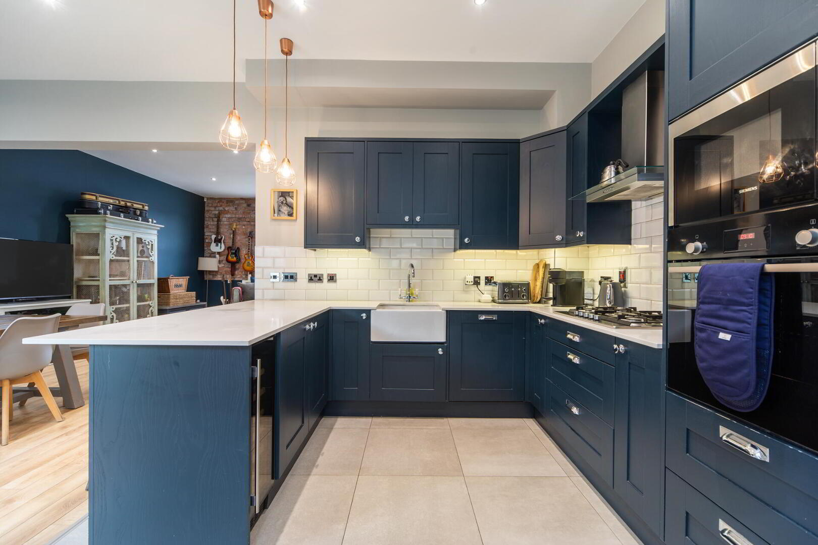 KITCHEN 16' 6" x 9' 8" (5.03m x 2.95m) Range of high and low level units, quartz work surfaces and drainer, Belfast sink unit with mixer taps, integrated dishwasher, integrated fridge freezer, integrated five ring gas hob, integrated microwave, integrated oven, integrated wine fridge, part tiled walls, ceramic tiled floor, low voltage spotlights, hardwood door and glazing to rear.