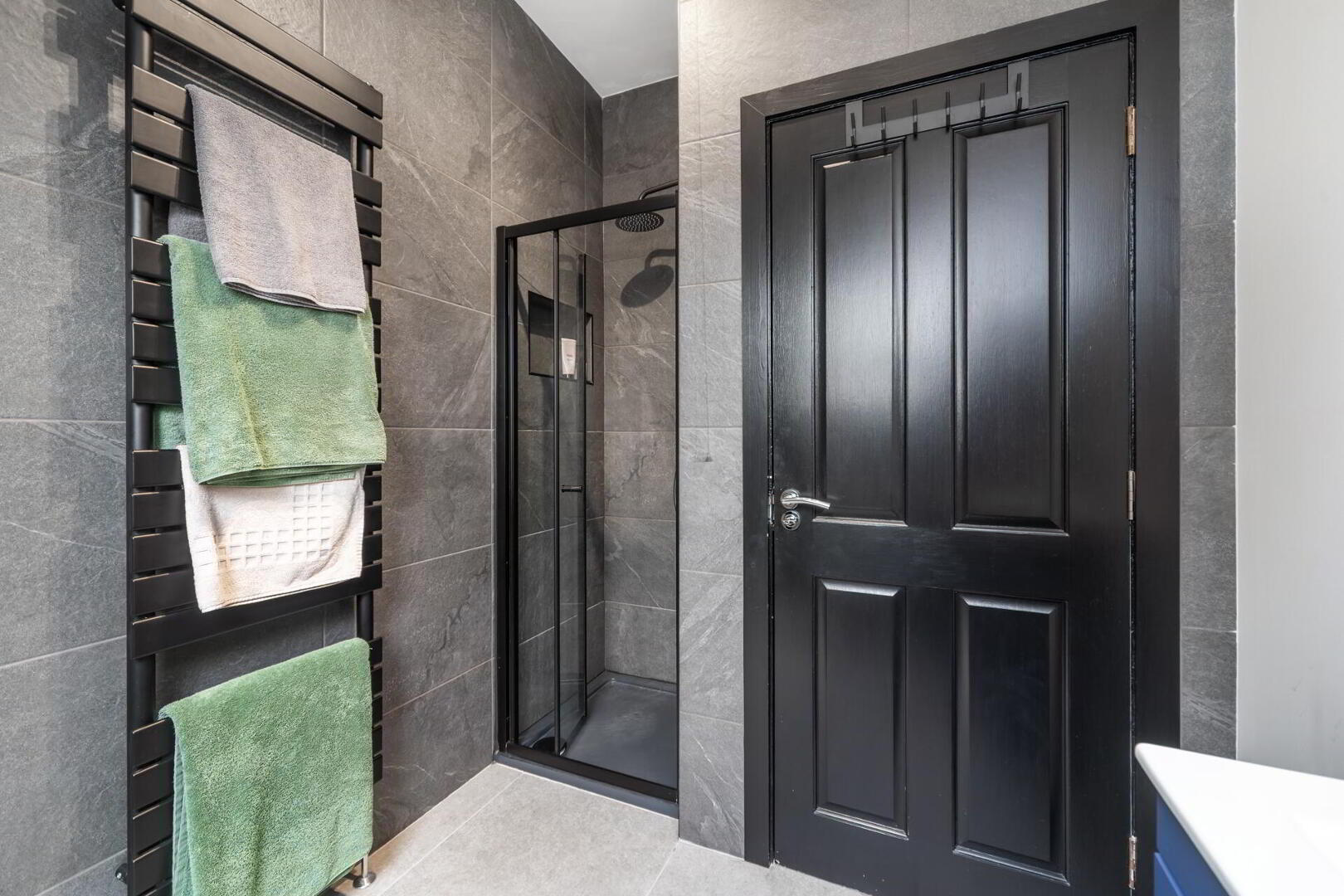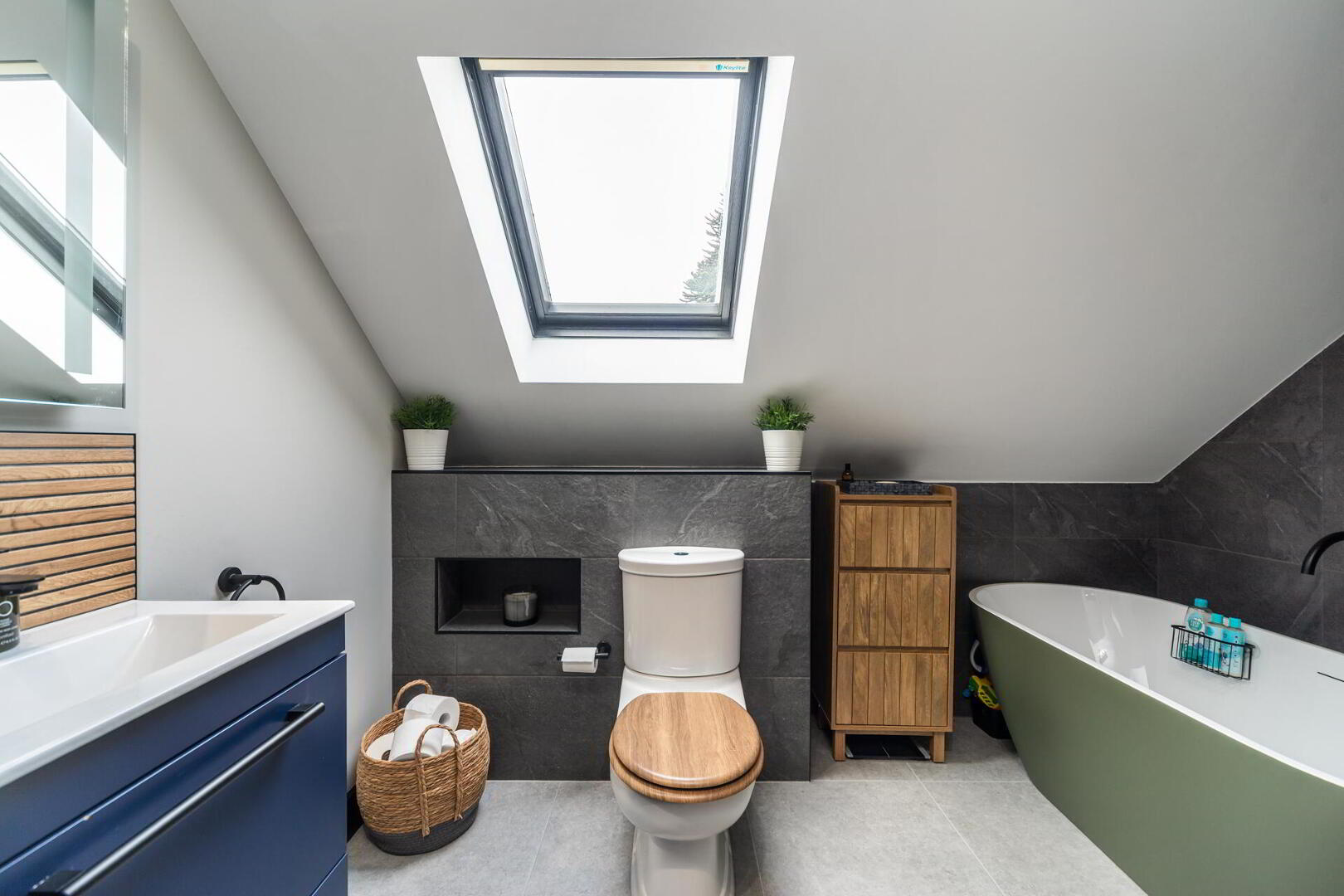 BATHROOM Suite comprising of a feature free standing bath with floor taps and hand shower, low flush wc, vanity wash hand basin with feature mirror and light, enclosed shower cubicle, feature radiator, part tiled walls, tiled floor, Velux window, extractor fan.