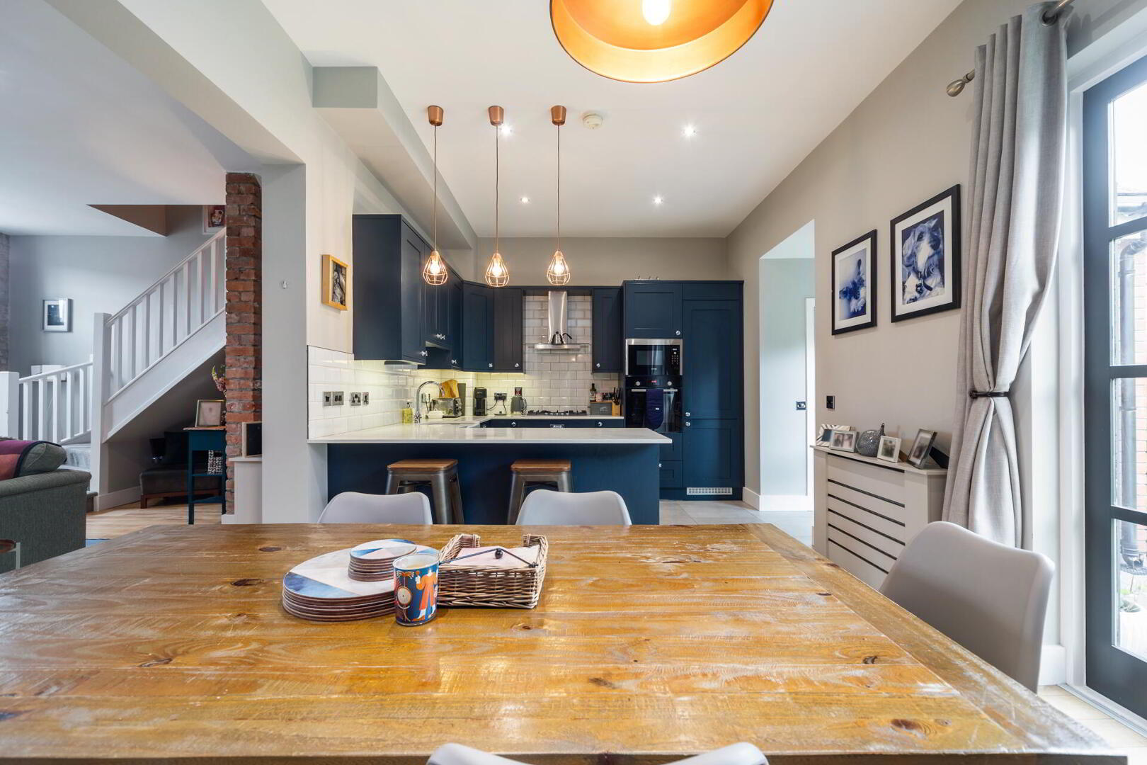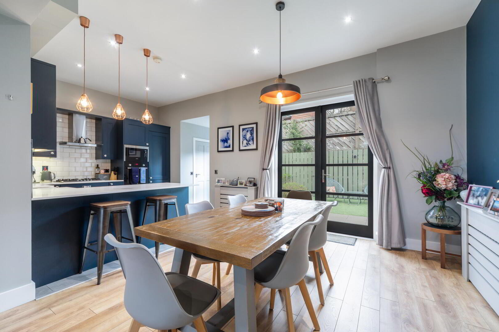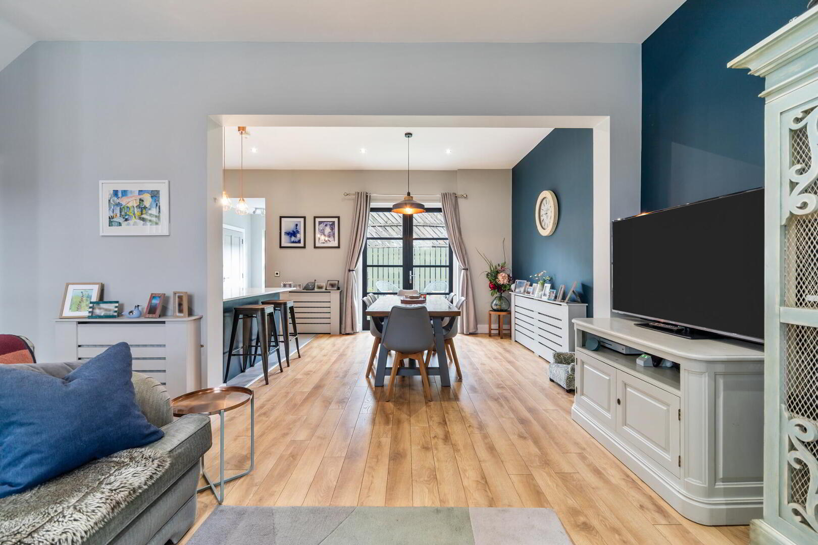 The ground floor boasts a superb open plan layout, comprising a bright and welcoming lounge through to a dining area, seamlessly flowing into a modern, fully fitted kitchen. The kitchen is finished with quartz work surfaces and a range of integrated appliances, creating both a stylish and functional space.
