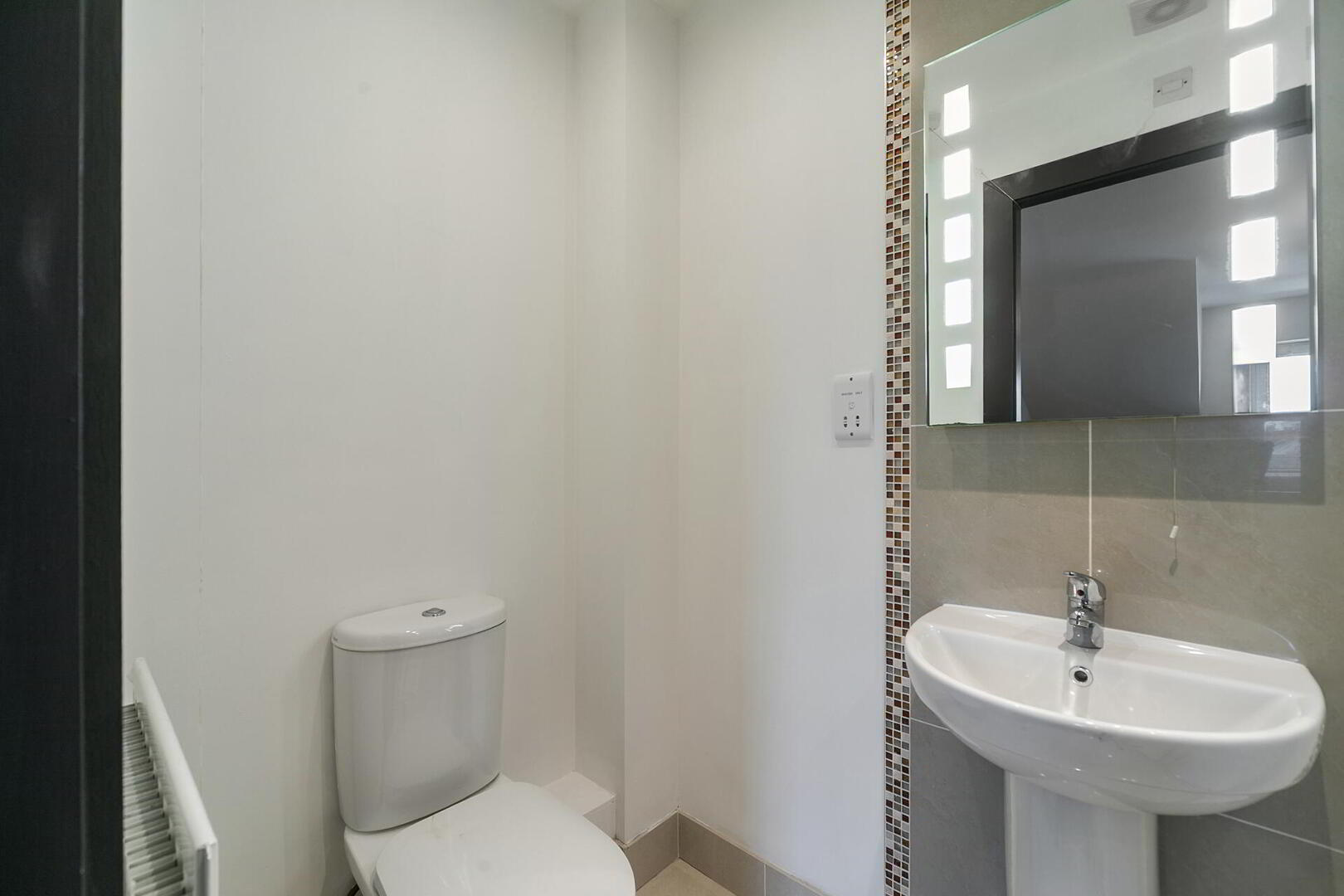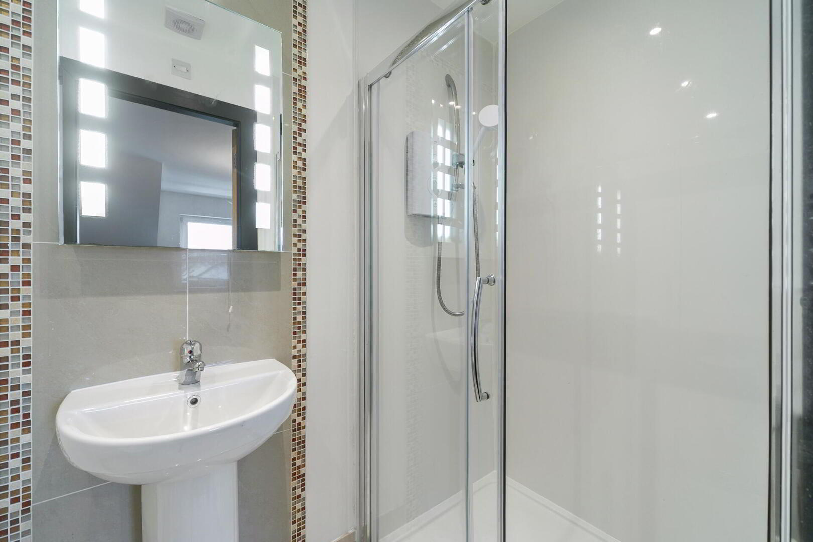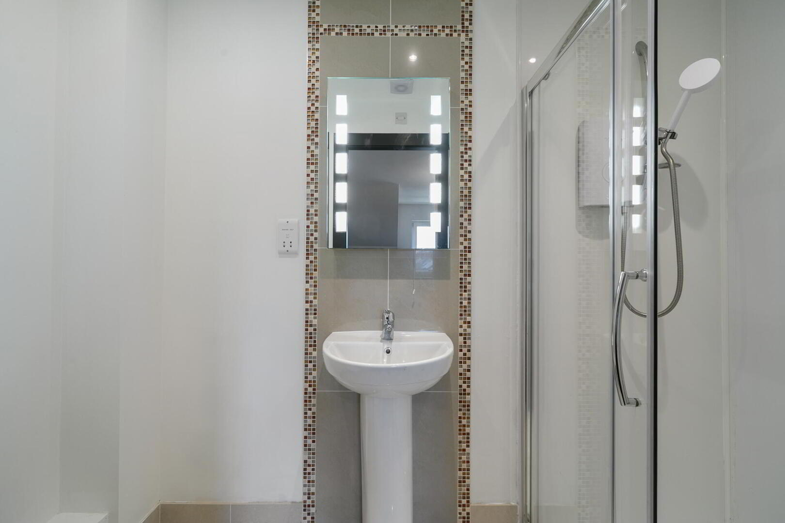 ENSUITE SHOWER ROOM White suite comprising low flush WC, pedestal wash hand basin, floor to ceiling splash tiling, panelled shower cubicle with Mira shower, tiled floor, low voltage spotlights, extractor fan.