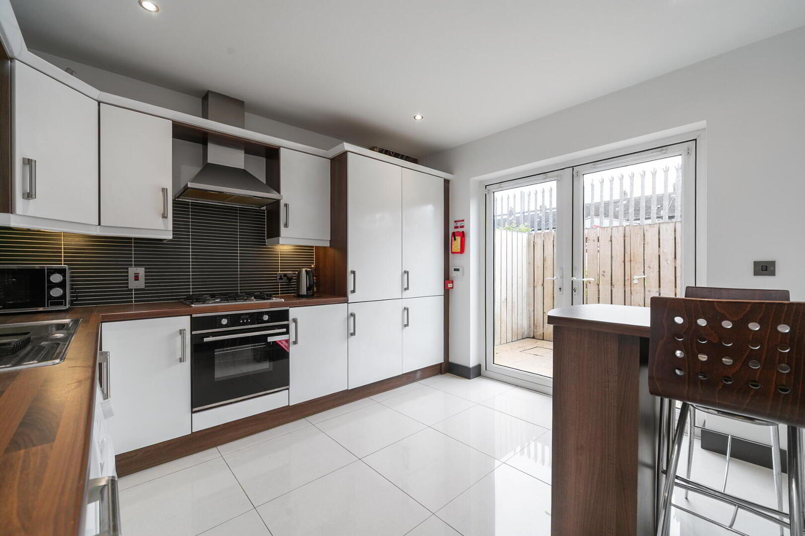 KITCHEN WITH BREAKFAST AREA 11' 8" x 11' 2" (3.56m x 3.4m) Range of high and low level units, work surfaces, 1.5 bowl single drainer stainless steel sink unit with mixer tap, four ring gas hob with electric oven under, extractor fan over, plumbed for washing machine, integrated fridge and freezer, concealed gas fired boiler, tiled floor, part tiled walls, under unit lighting, breakfast bar with shelves and integrated wine rack, low voltage spotlights, uPVC double glazed patio door to rear garden sitting area.