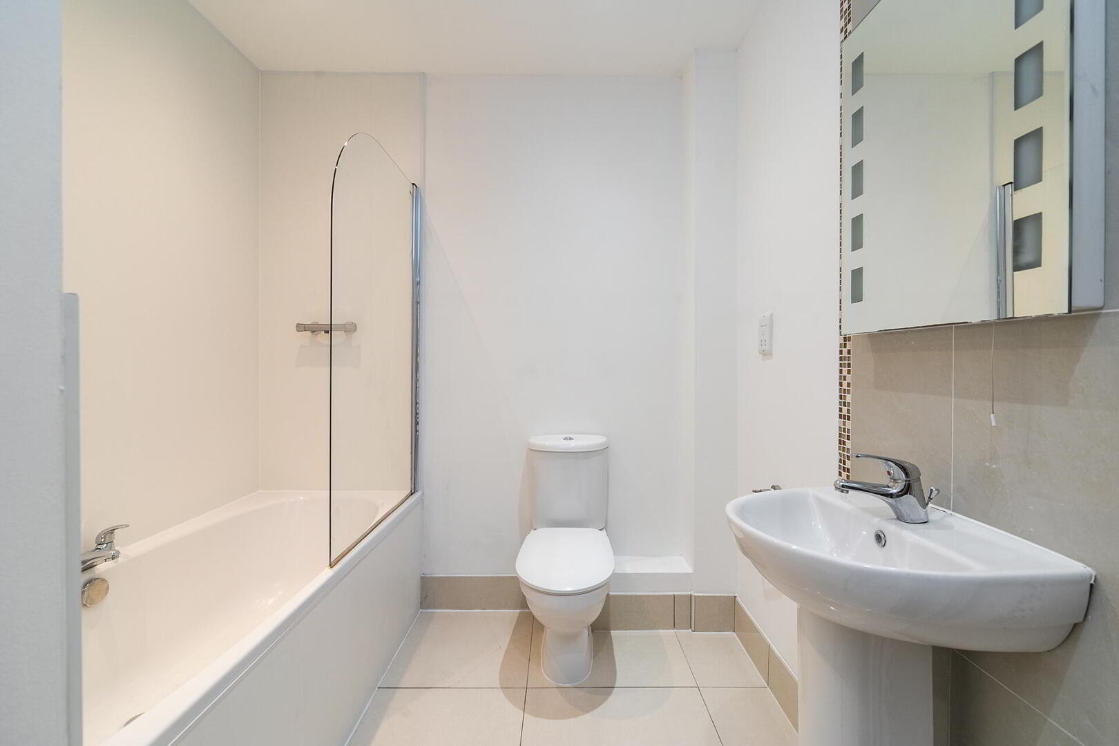 BATHROOM White suite comprising panelled bath with mixer tap and panelled walls, low flush WC, pedestal wash hand basin, floor to ceiling splash tiling, tiled floor, low voltage spotlights, extractor fan.