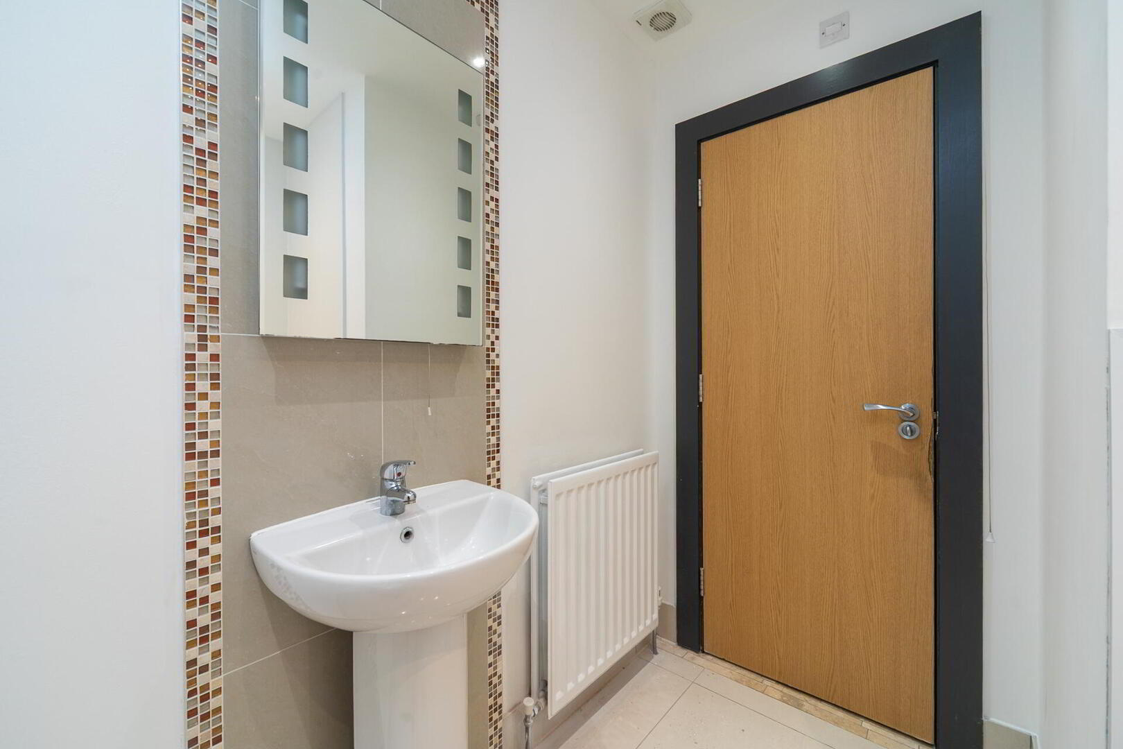 CLOAKROOM White suite comprising low flush WC, pedestal wash hand basin, floor to ceiling splash tiling, tiled floor, part tiled walls.