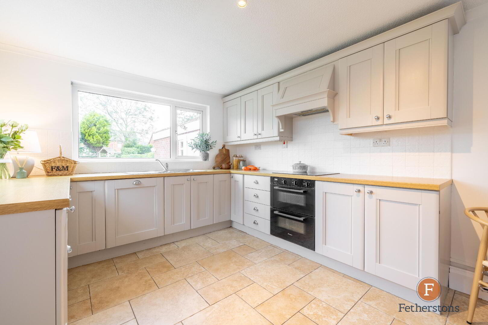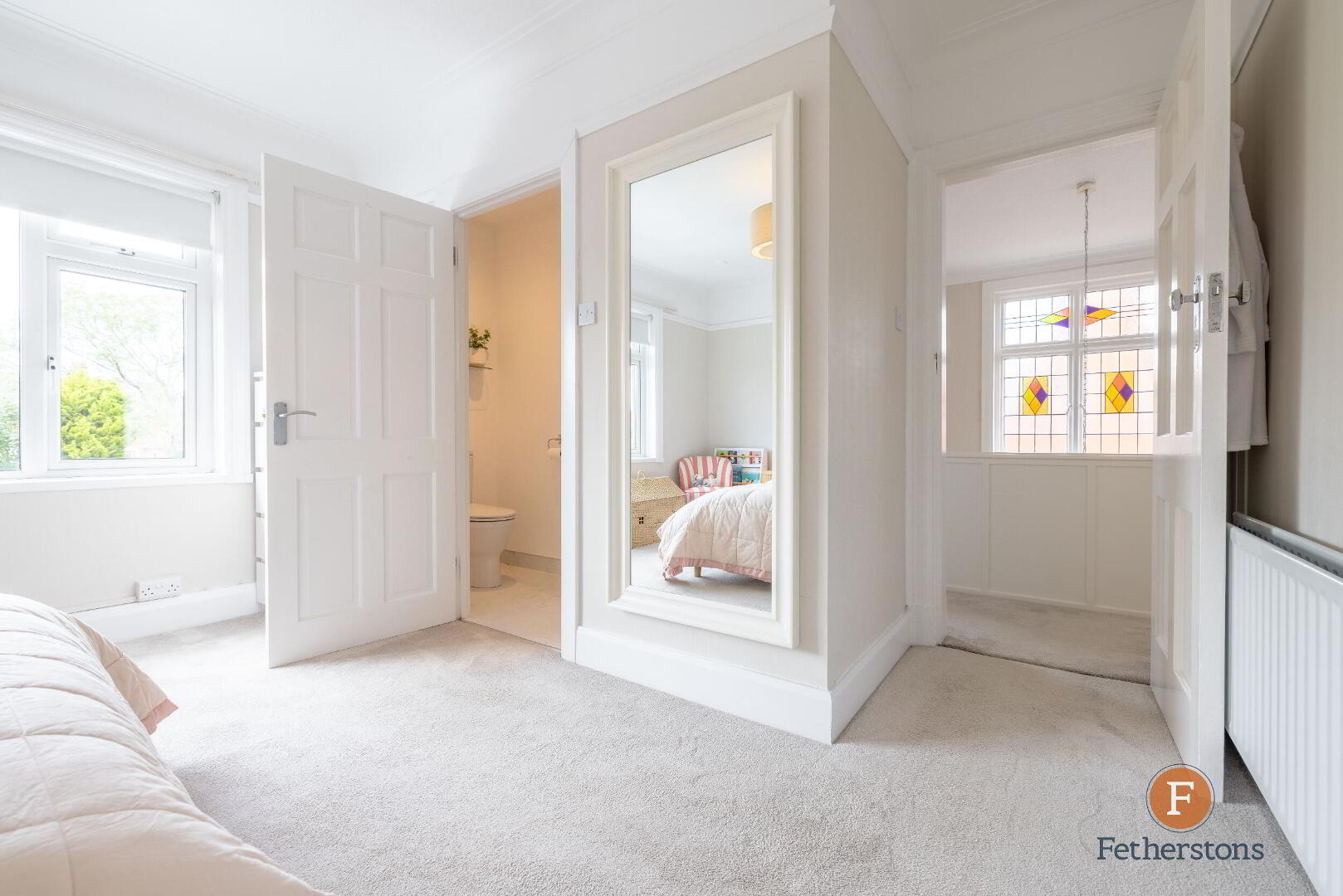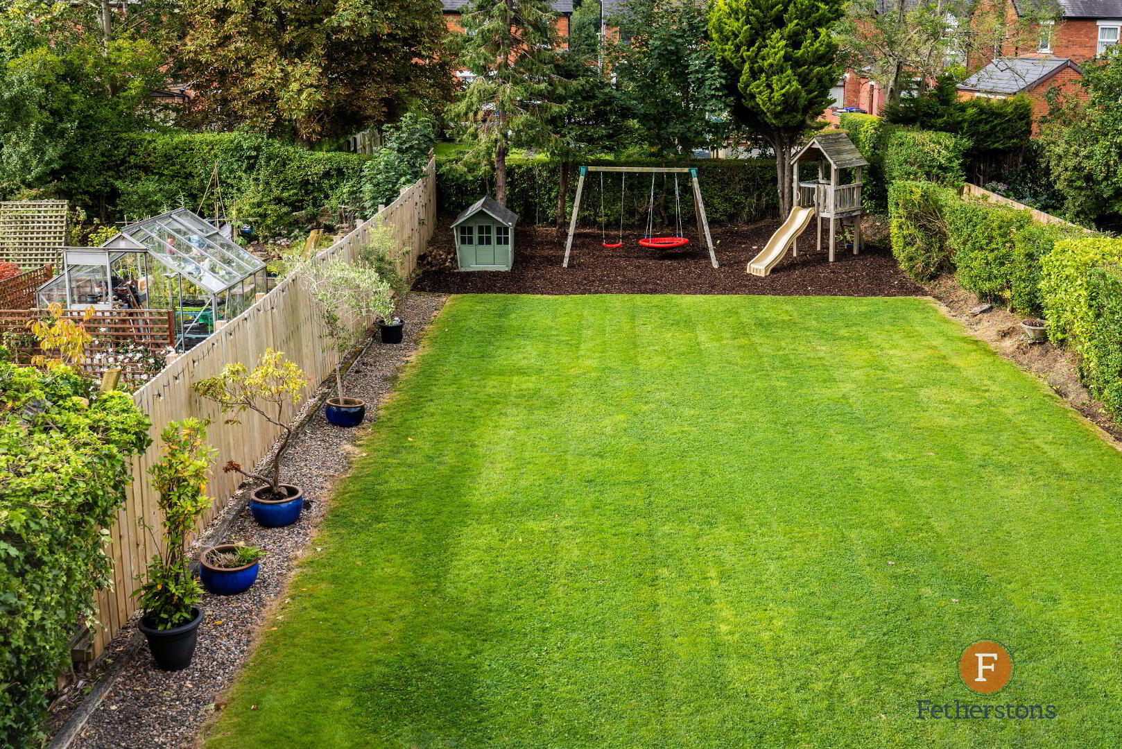 OUTSIDE Front garden in lawns with boundary railings and planting, driveway parking leading to detached garage. Superb level south facing rear garden in generous lawns with boundary fencing and hedges, childrens wood chip play area, sheltered seating area.
