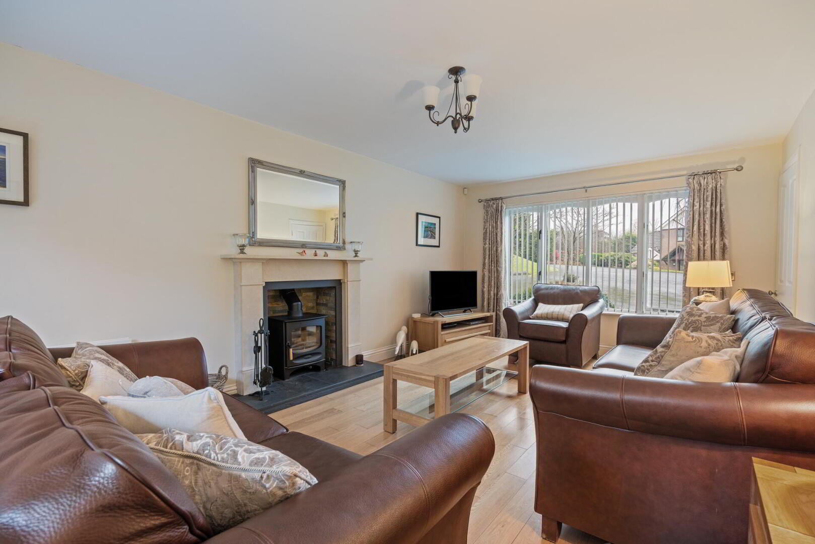 LOUNGE 19' 10" x 11' 8" (6.07m x 3.58m) Feature wood burning stove with tiled hearth, marble mantle and surround, wooden floor, sliding doors to rear patio / garden.