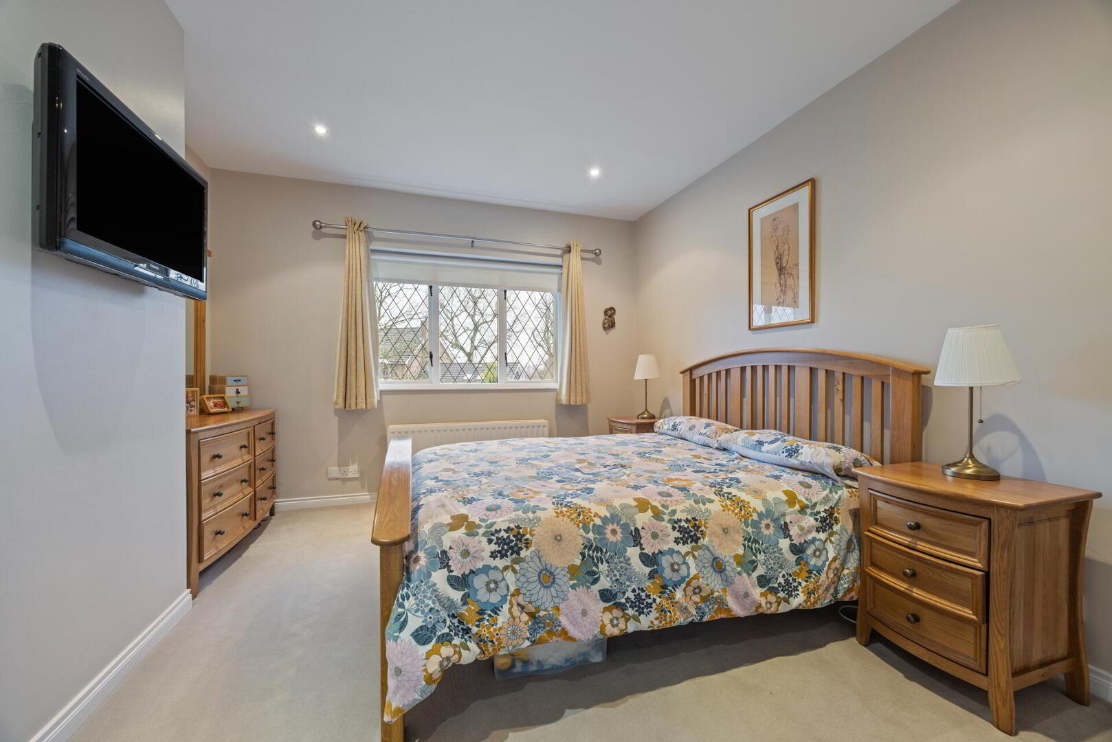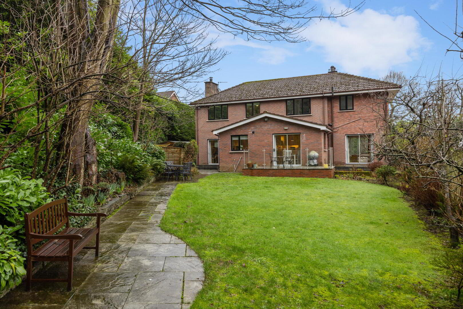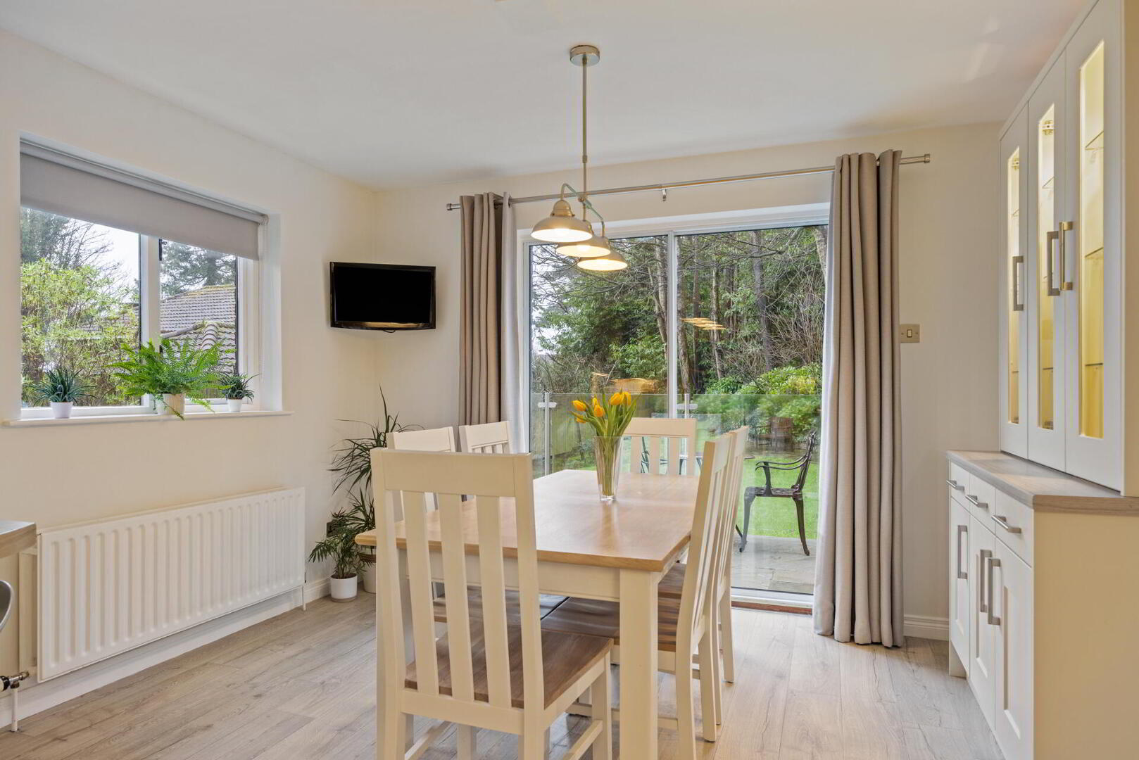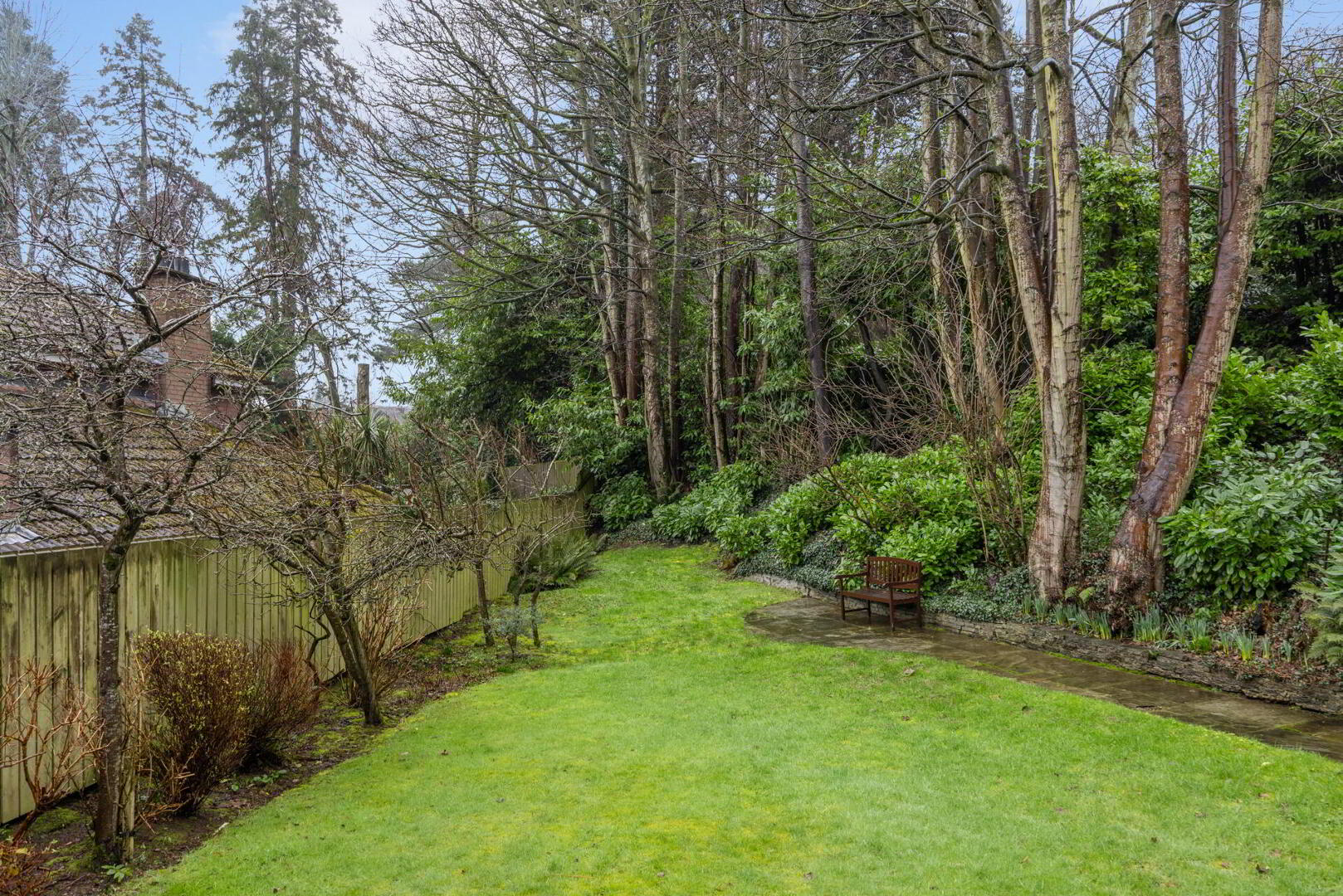 Large, private and enclosed rear garden laid in lawn with mature shrubs, trees and bushes. Timber fencing, outside tap, motion detector spot lighting front and rear.