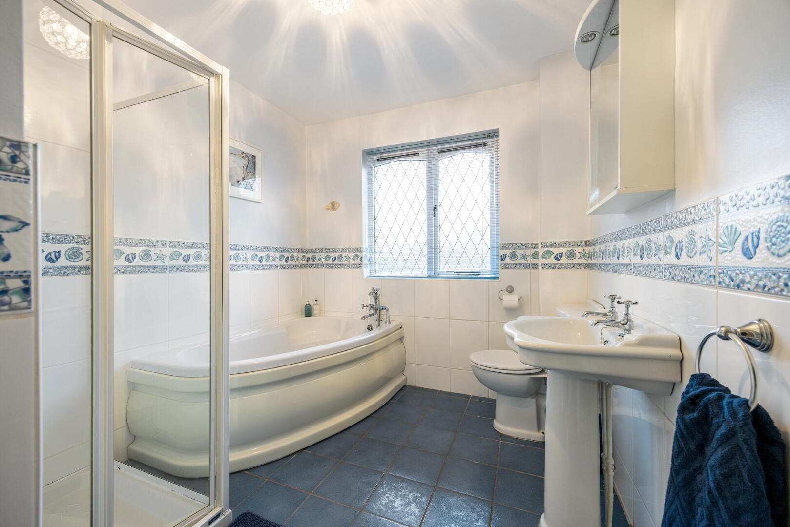 FAMILY BATHROOM Fully tiled shower cubicle with electric shower, corner bath with chrome taps, pedestal wash hand basin with chrome taps, low flush w.c, fully tiled walls, tiled floor.