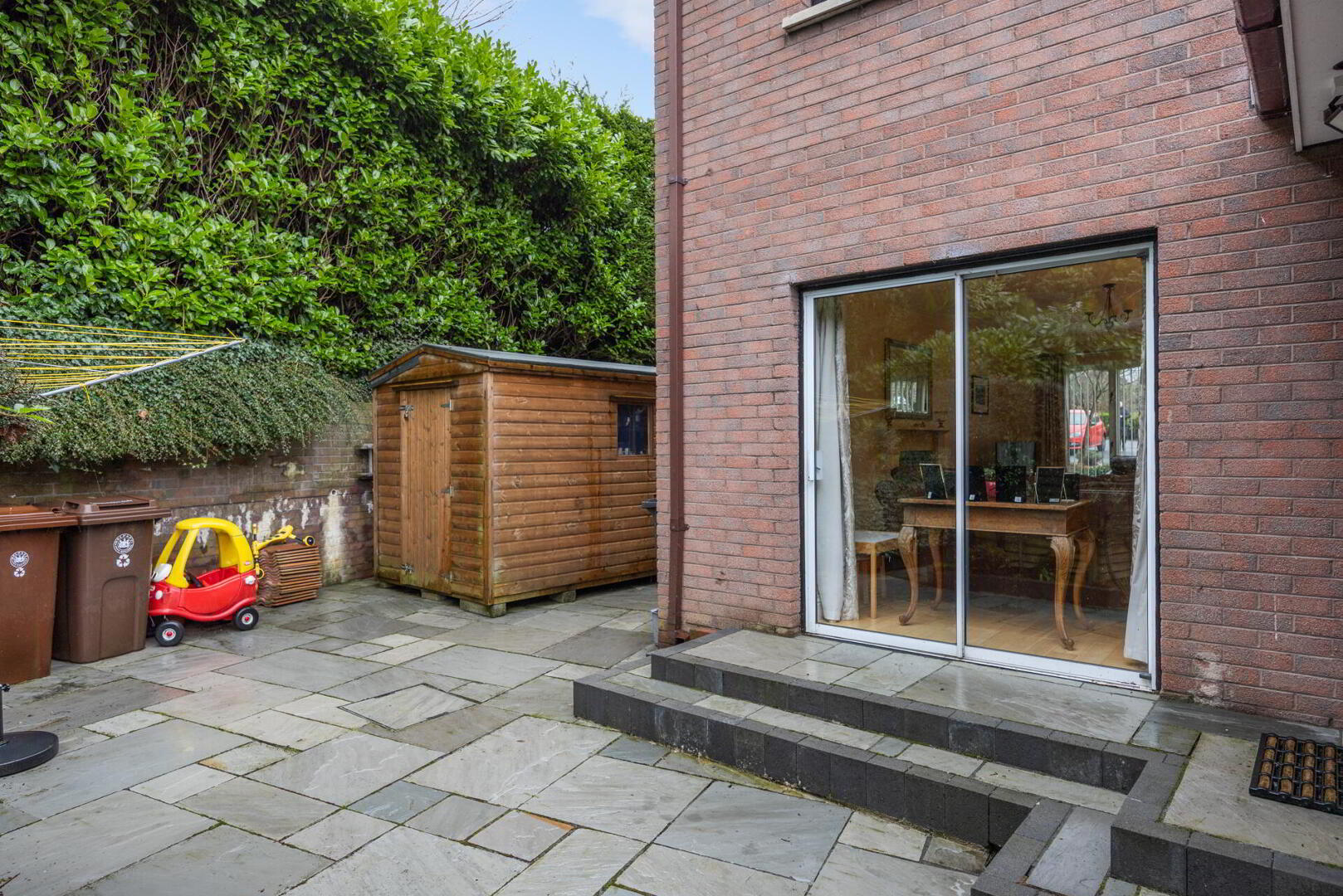 A further two patio areas are accessed directly from both the lounge and family room respectively, which ensures the garden is always in play. There is an excellent storage area to the side and a driveway offering parking for several vehicles is to the front.