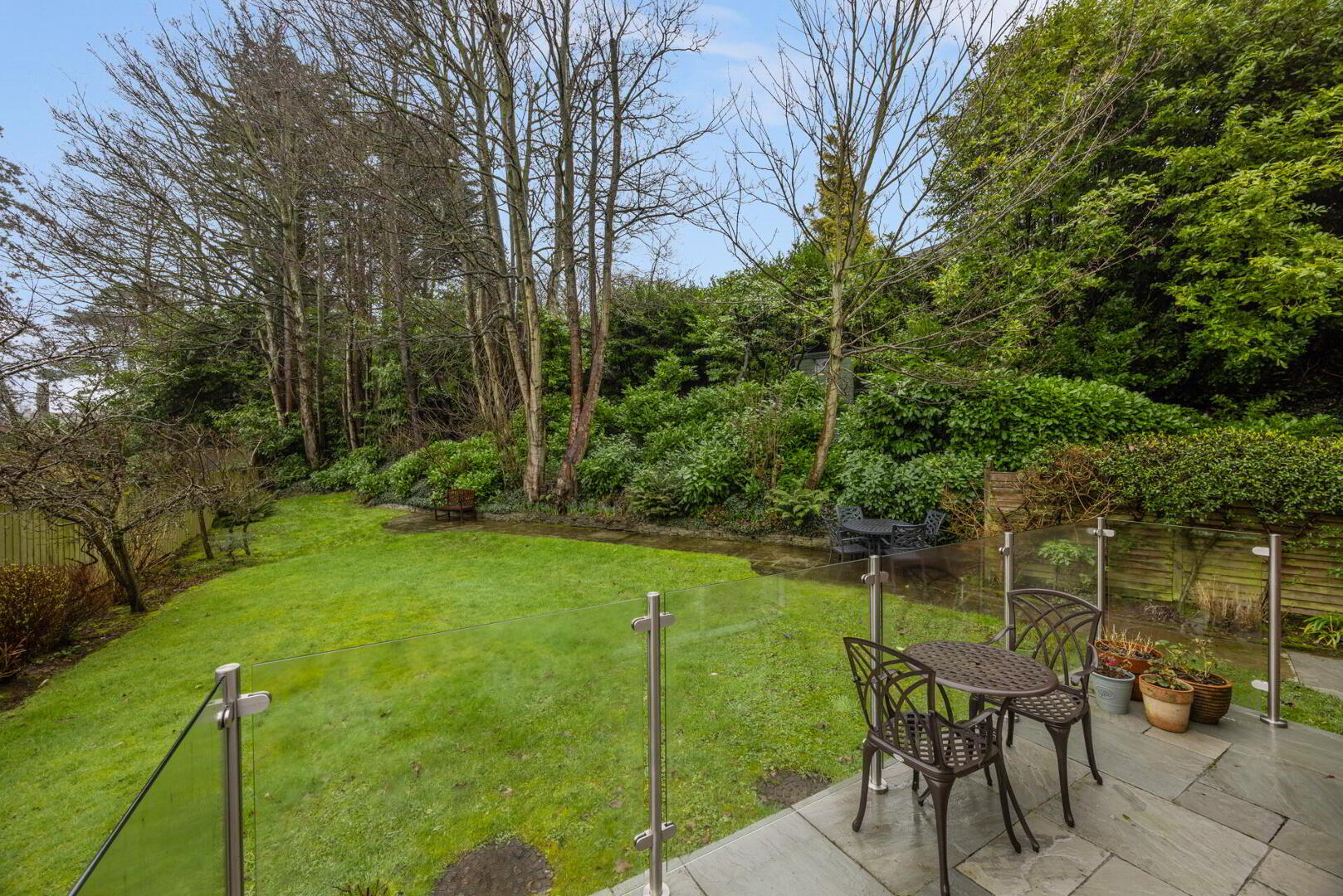 Raised patio with glass balustrade overlooking rear garden (access from kitchen / dining room)