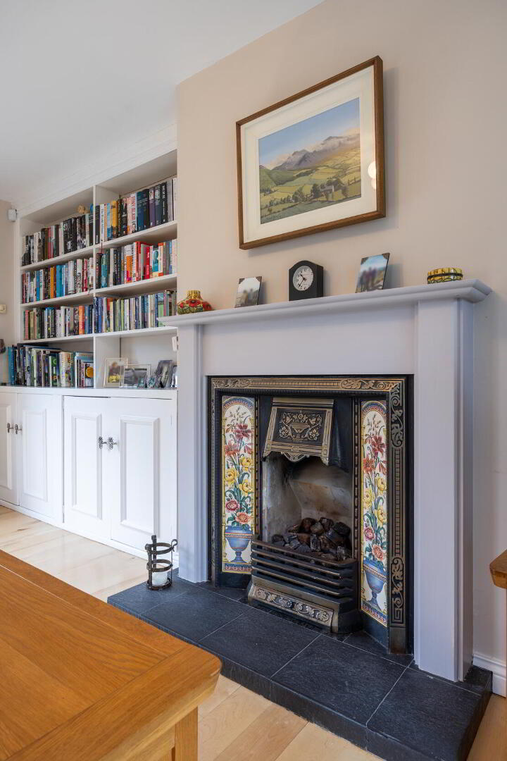 FAMILY ROOM 17' 10" x 11' 8" (5.46m x 3.56m) Feature gas fire with tiled hearth and inset, wooden floor, built in shelving with storage under, sliding doors to rear garden /patio.