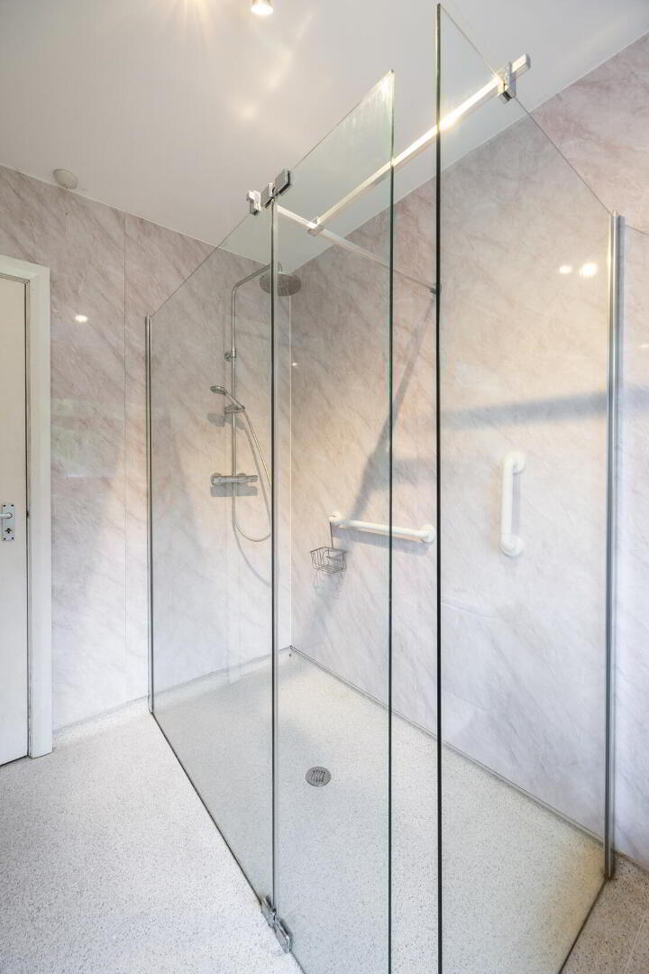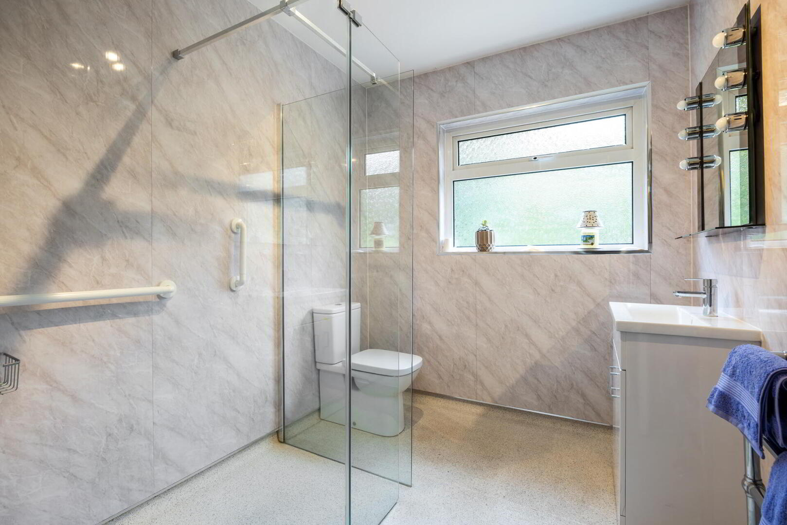 SHOWER ROOM White suite comprising low flush WC, vanity unit with storage, walk in shower cubicle with rainwater shower, panelled walls, heated towel rail.