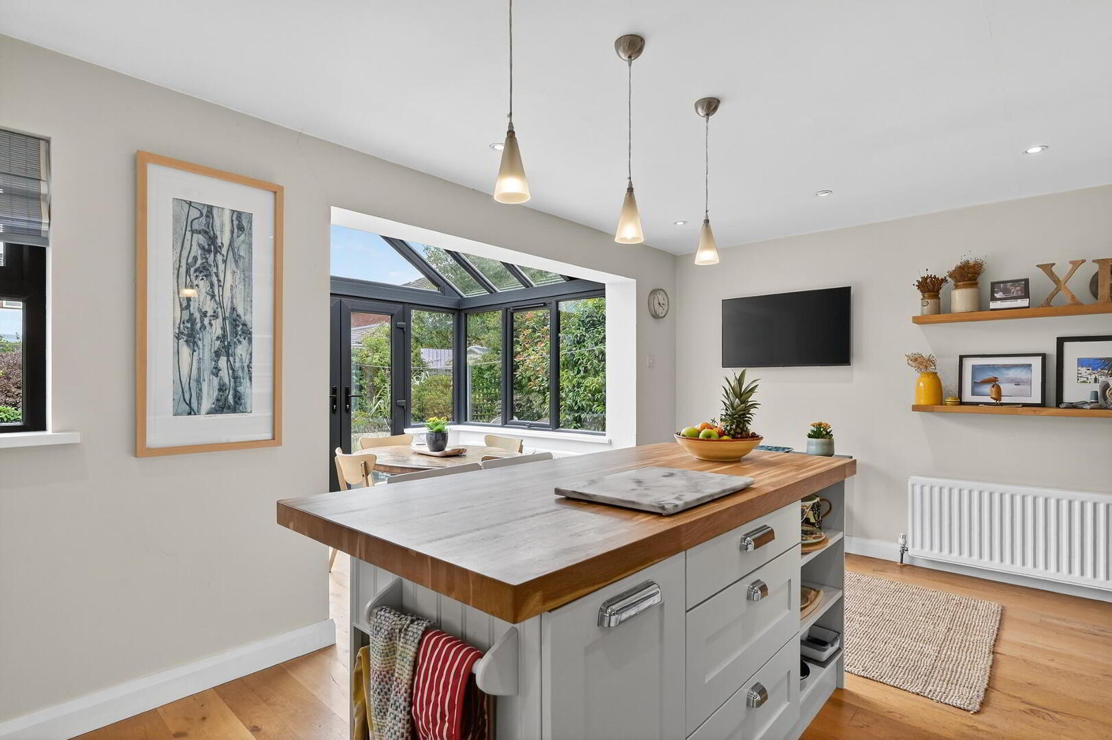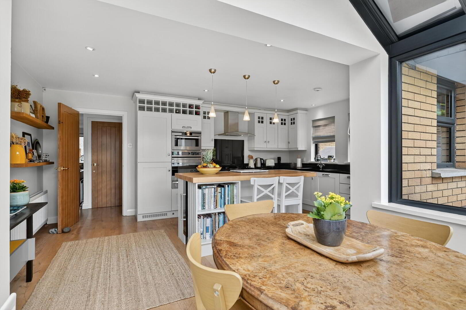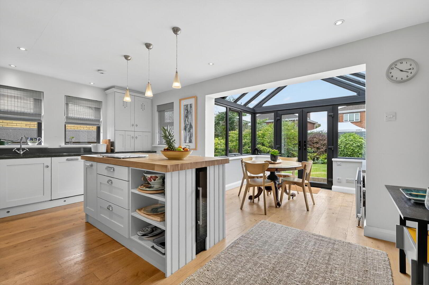 KITCHEN WITH DINING AREA OPEN PLAN TO CONSERVATORY 17' 8" x 19' 7" (5.38m x 5.97m) (@ widest points overall) Extensive range of high and low level units, granite work surfaces with coloured safety glass splash back, Scholtes four ring gas hob with matching back painted glass splash back and extractor fan over, Franke stainless steel sink unit with granite drainer, integrated dishwasher, electric oven with microwave oven and heating drawer, integrated fridge and freezer, island unit with wooden work surfaces and breakfast bar, solid wood flooring, low voltage spotlights, uPVC double glazed patio doors to rear.