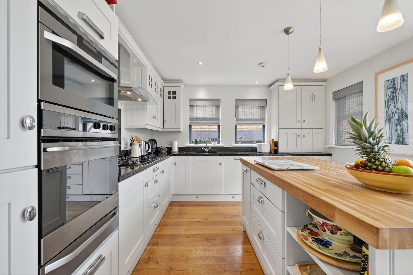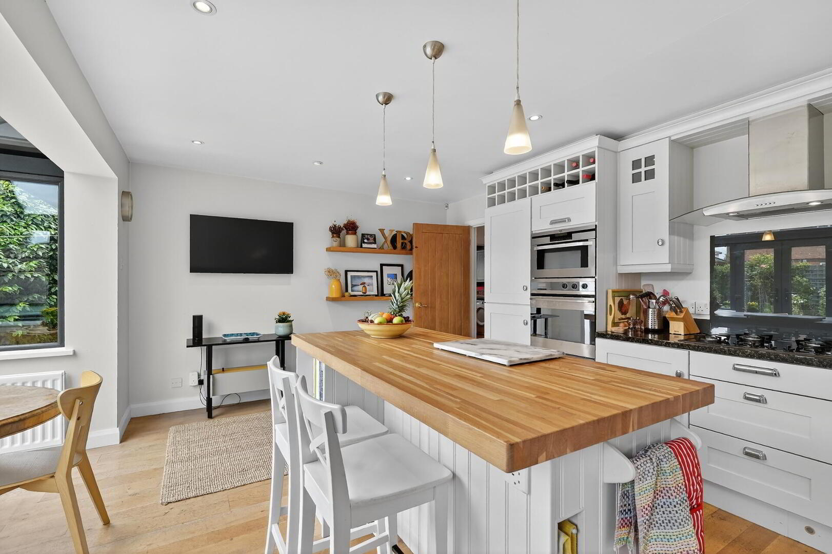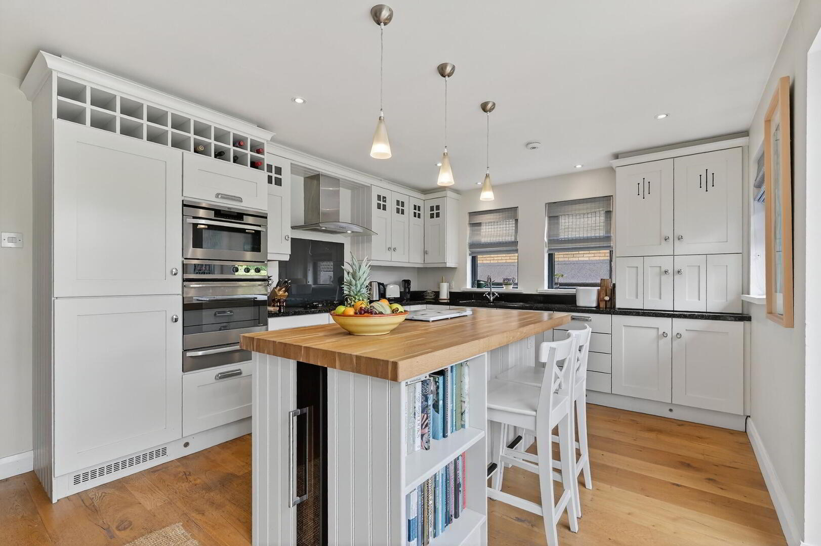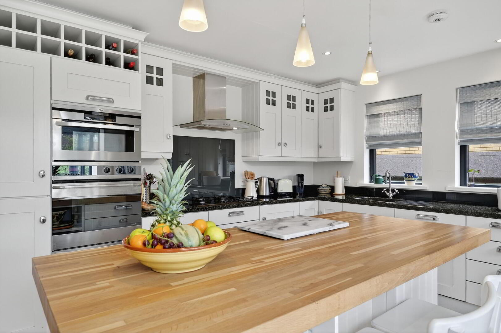 KITCHEN WITH DINING AREA OPEN PLAN TO CONSERVATORY 17' 8" x 19' 7" (5.38m x 5.97m) (@ widest points overall) Extensive range of high and low level units, granite work surfaces with coloured safety glass splash back, Scholtes four ring gas hob with matching back painted glass splash back and extractor fan over, Franke stainless steel sink unit with granite drainer, integrated dishwasher, electric oven with microwave oven and heating drawer, integrated fridge and freezer, island unit with wooden work surfaces and breakfast bar, solid wood flooring, low voltage spotlights, uPVC double glazed patio doors to rear.