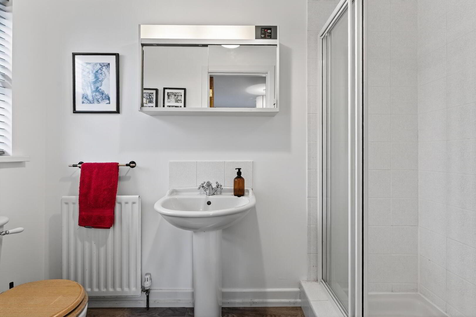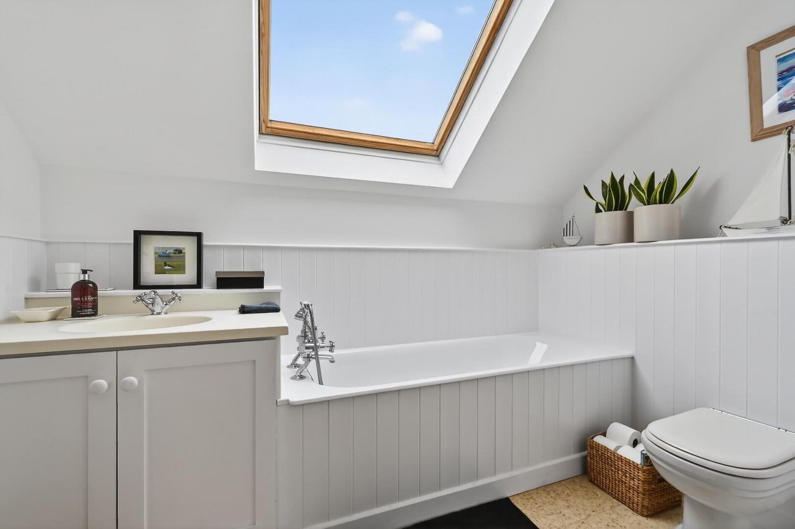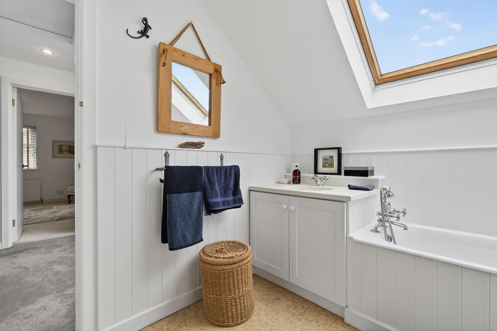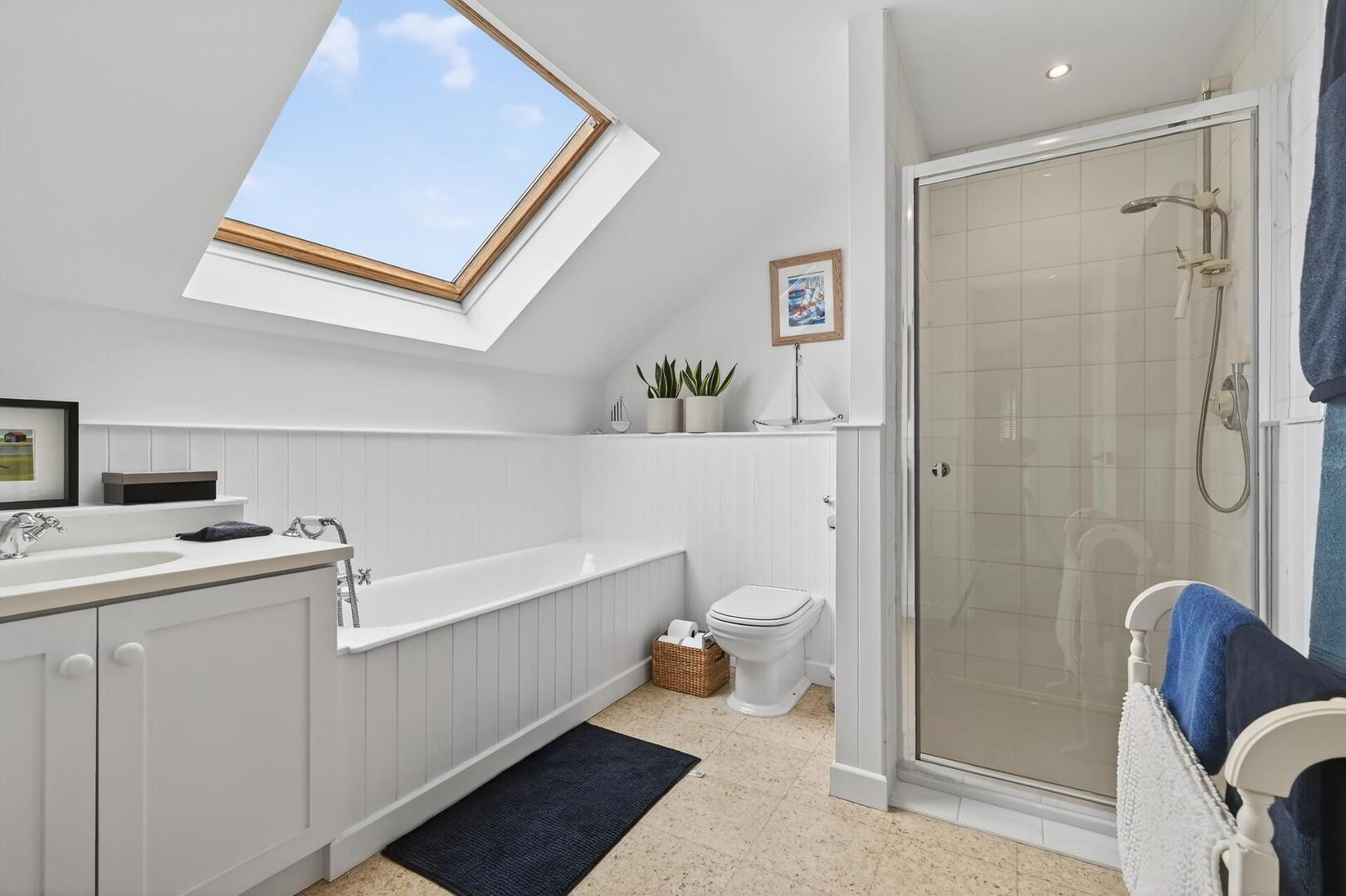 BATHROOM White suite comprising panelled bath with mixer tap and telephone hand shower, vanity unit, WC, fully tiled shower cubicle, Velux window, low voltage spotlights, extractor fan, part tongue and groove panelled walls, heated towel rail.