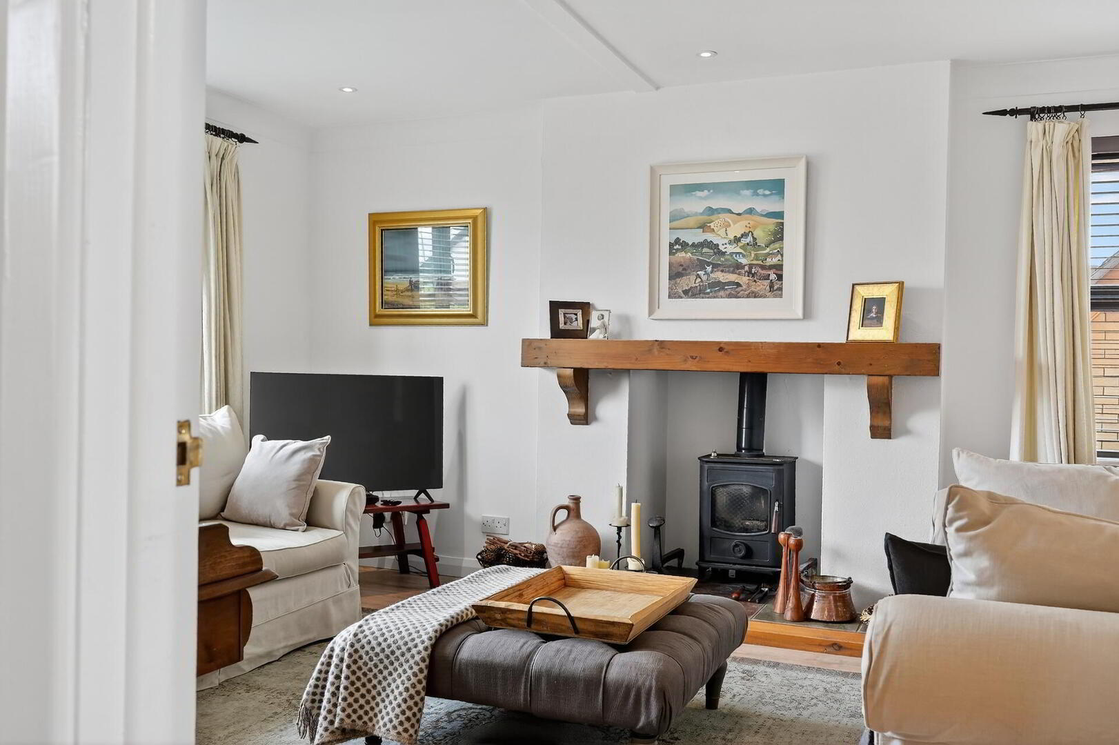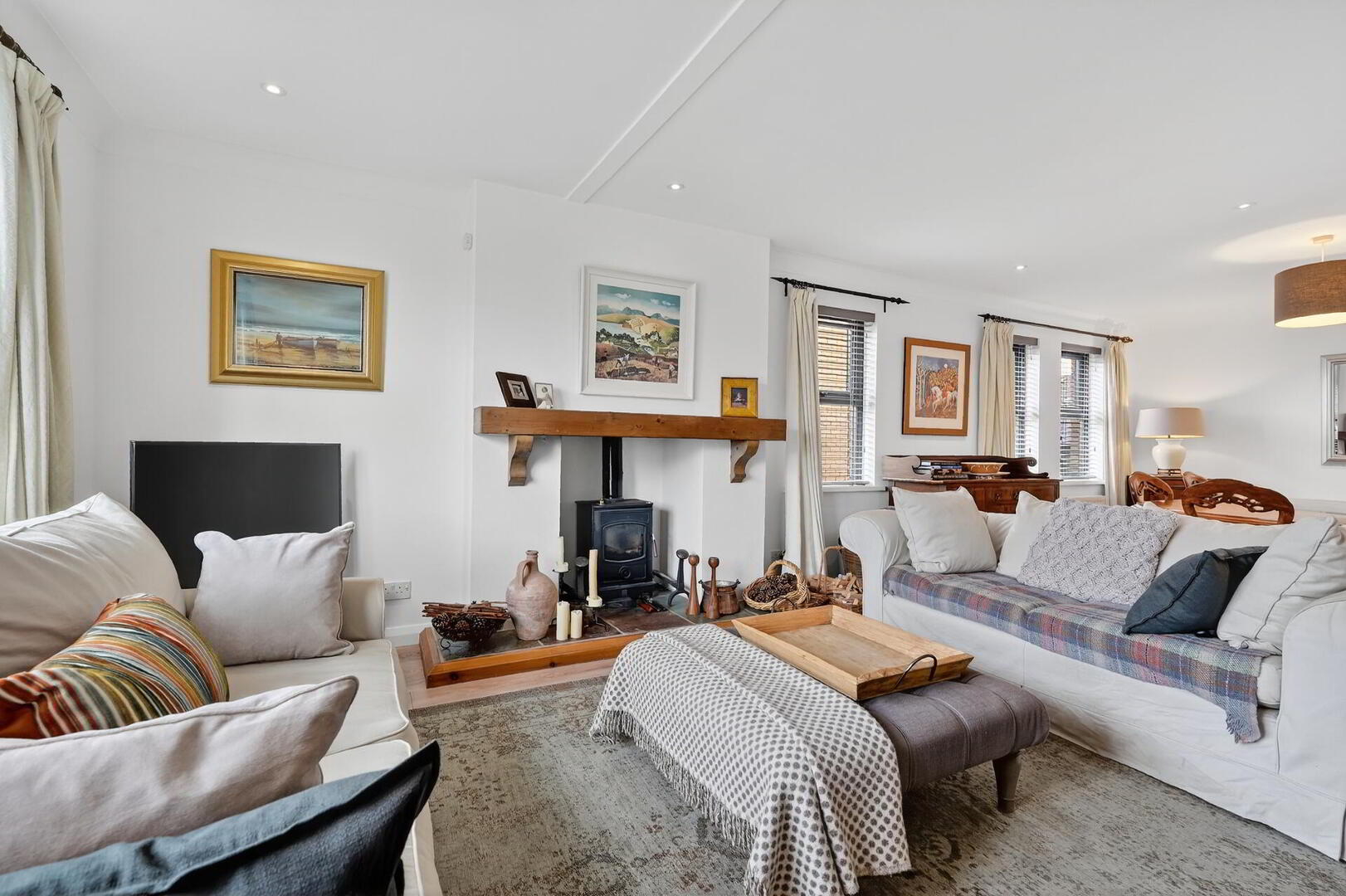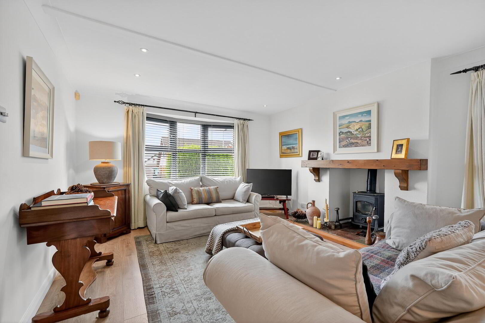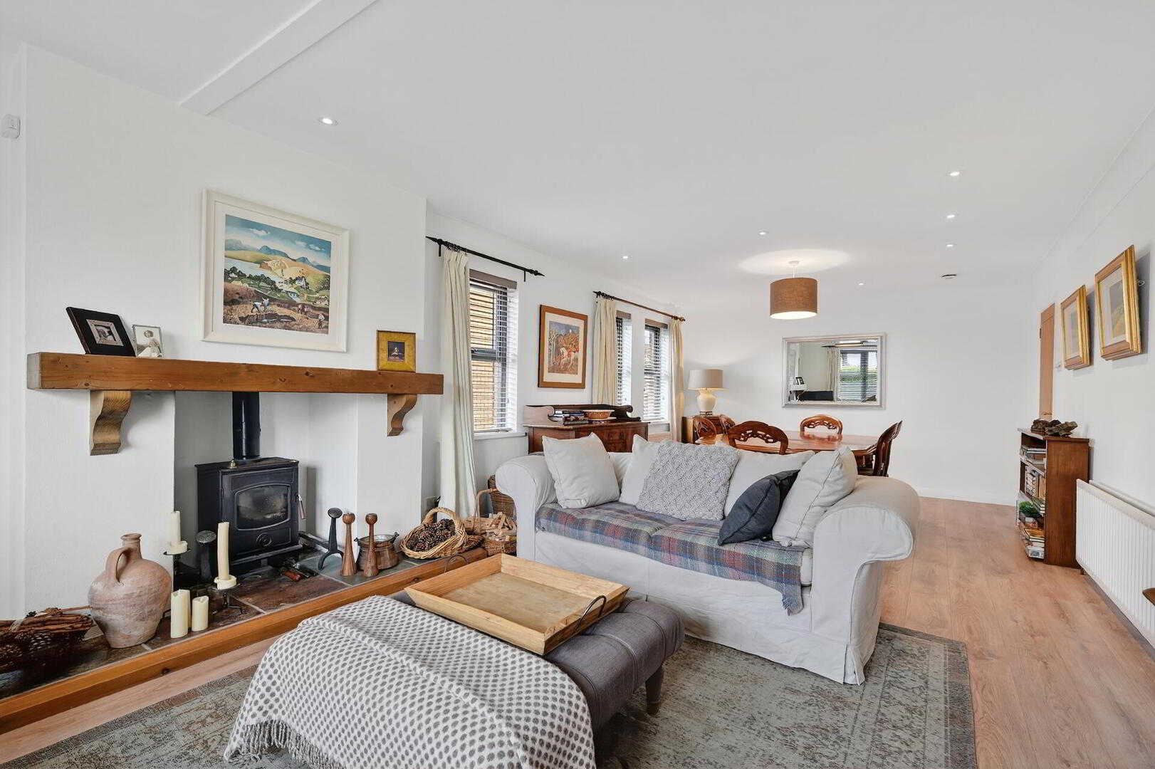 LIVING ROOM OPEN PLAN TO DINING ROOM 26' 6" x 12' 9" (8.08m x 3.89m) Laminate wood effect floor, feature fireplace with cast iron stove, slate hearth and wood beam mantle, low voltage spotlights.
