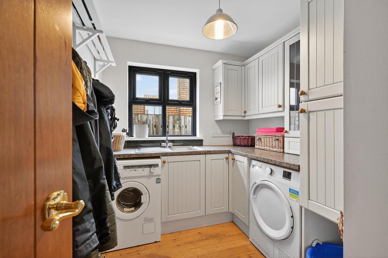 UTILITY ROOM 9' 2" x 7' 2" (2.79m x 2.18m) Range of high and low level units, work surfaces, single drainer stainless steel sink unit with mixer tap, plumbed for washing machine, space for tumble dryer, wood flooring.