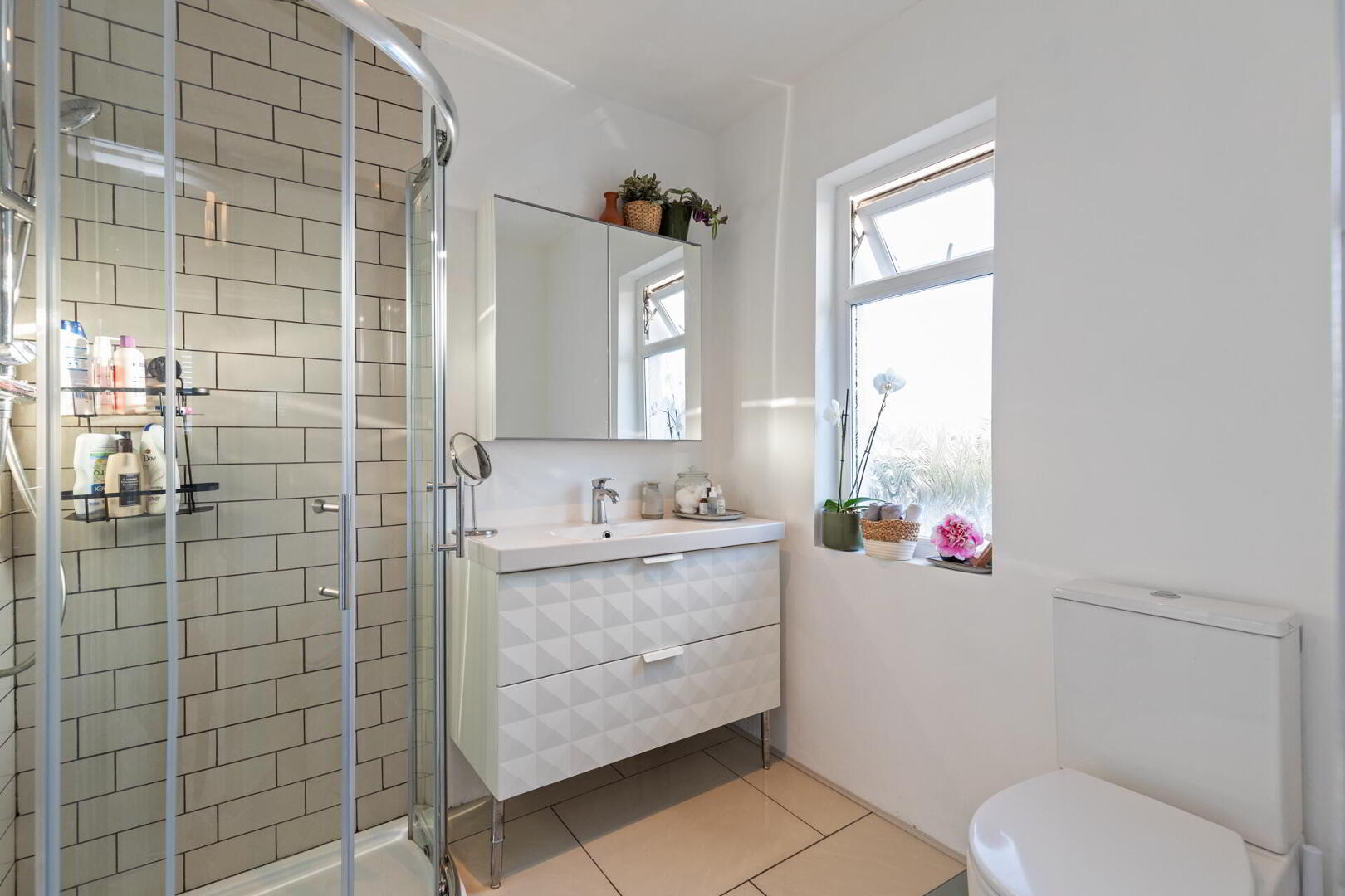 SHOWER ROOM White suite comprising low flush WC, vanity unit with storage, fully tiled shower cubicle, rainwater shower, tiled floor.