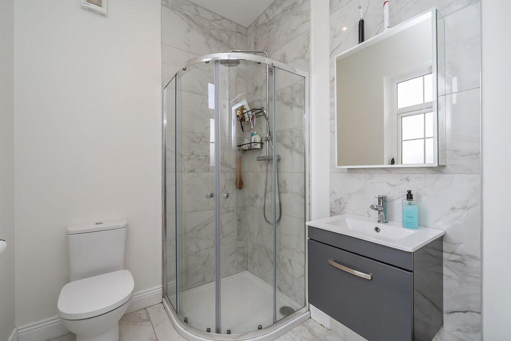 ENSUITE White suite comprising low flush wc, vanity unit with floor to ceiling splash tiling, fully tiled shower cubicle with rainwater shower, tiled floor, low voltage spots, extractor fan