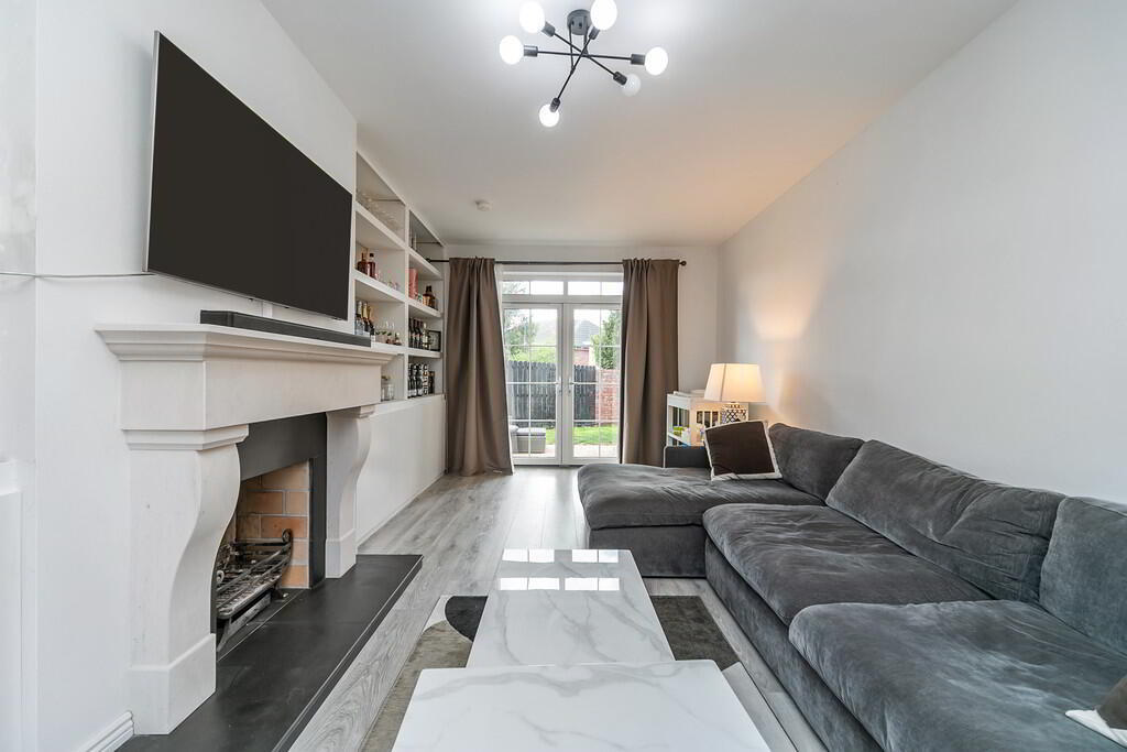 LOUNGE 23' 0" x 11' 8" (7.01m x 3.56m) Wood flooring, feature Limestone fireplace with slate hearth, bespoke display shelves and storage, uPVC double glazed patio doors to rear