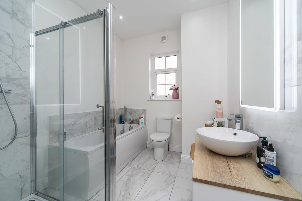 BATHROOM White suite comprising panelled bath with splash tiling, low flush wc, vanity unit with storage and floor to ceiling splash tiling, fully tiled shower cubicle with rainwater shower, tiled floor, low voltage spots, extractor fan