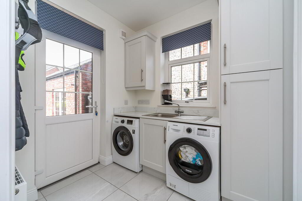 UTILITY ROOM 7' 3" x 7' 2" (2.21m x 2.18m) Range if units, work surfaces with matching splashback, single drainer stainless steel sink unit with mixer tap, plumbed for washing machine, space for tumble dryer, Polished tiled floor, uPVC door to rear