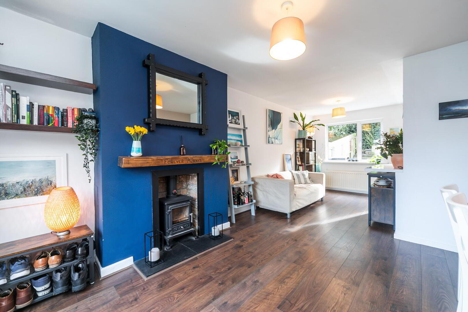 LOUNGE 11' 4" x 13' 2" (3.45m x 4.01m) Laminate wood effect floor, feature cast iron fireplace, slate hearth wood beam mantle.
