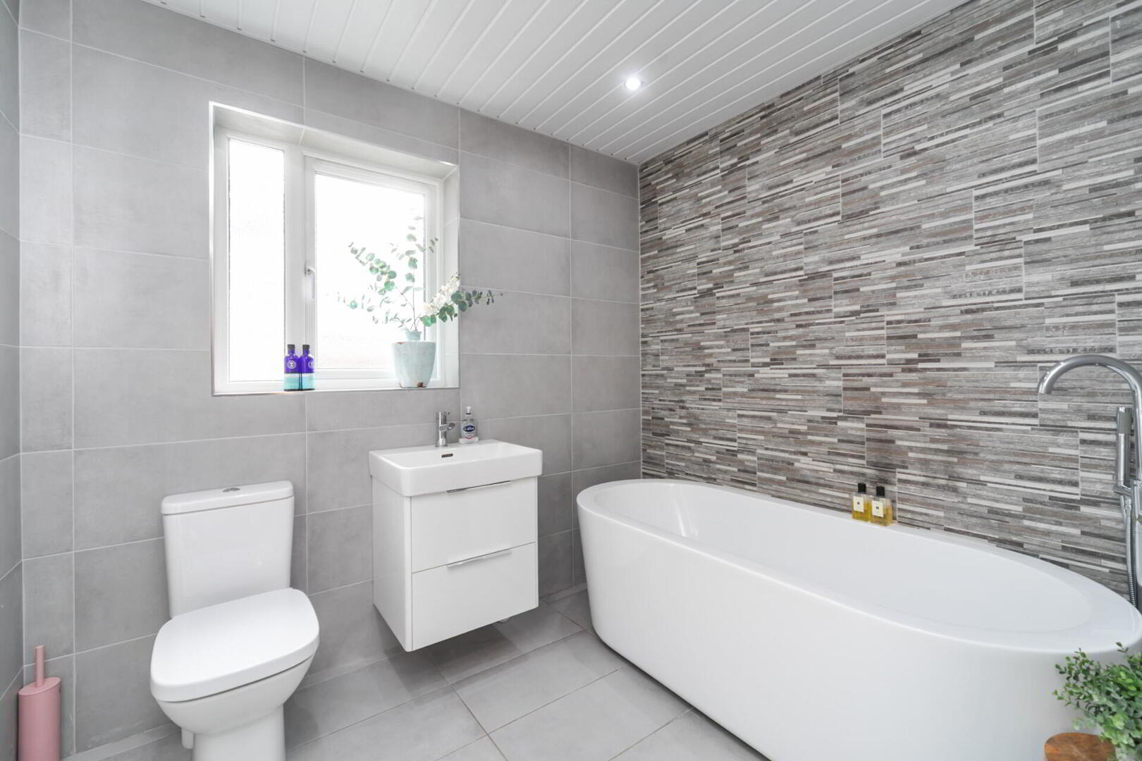 BATHROOM White suite comprising panelled bath with mixer tap, vanity unit with storage, low flush WC, chrome heated towel rail, fully tiled walls, tiled floor, panelled ceiling, low voltage spotlights.