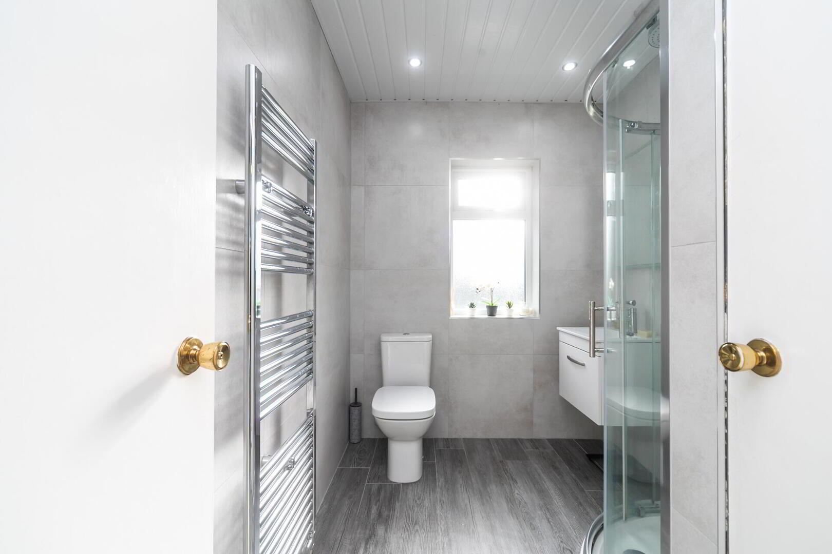 SHOWER ROOM White suite comprising low flush WC, vanity unit with storage, fully tiled shower cubicle with rainwater shower, chrome heated towel rail, panelled walls and ceiling, tiled floor, airing cupboard, low voltage spotlights.