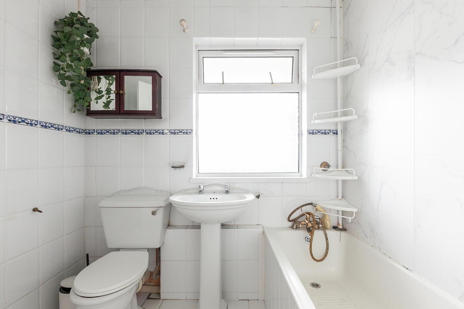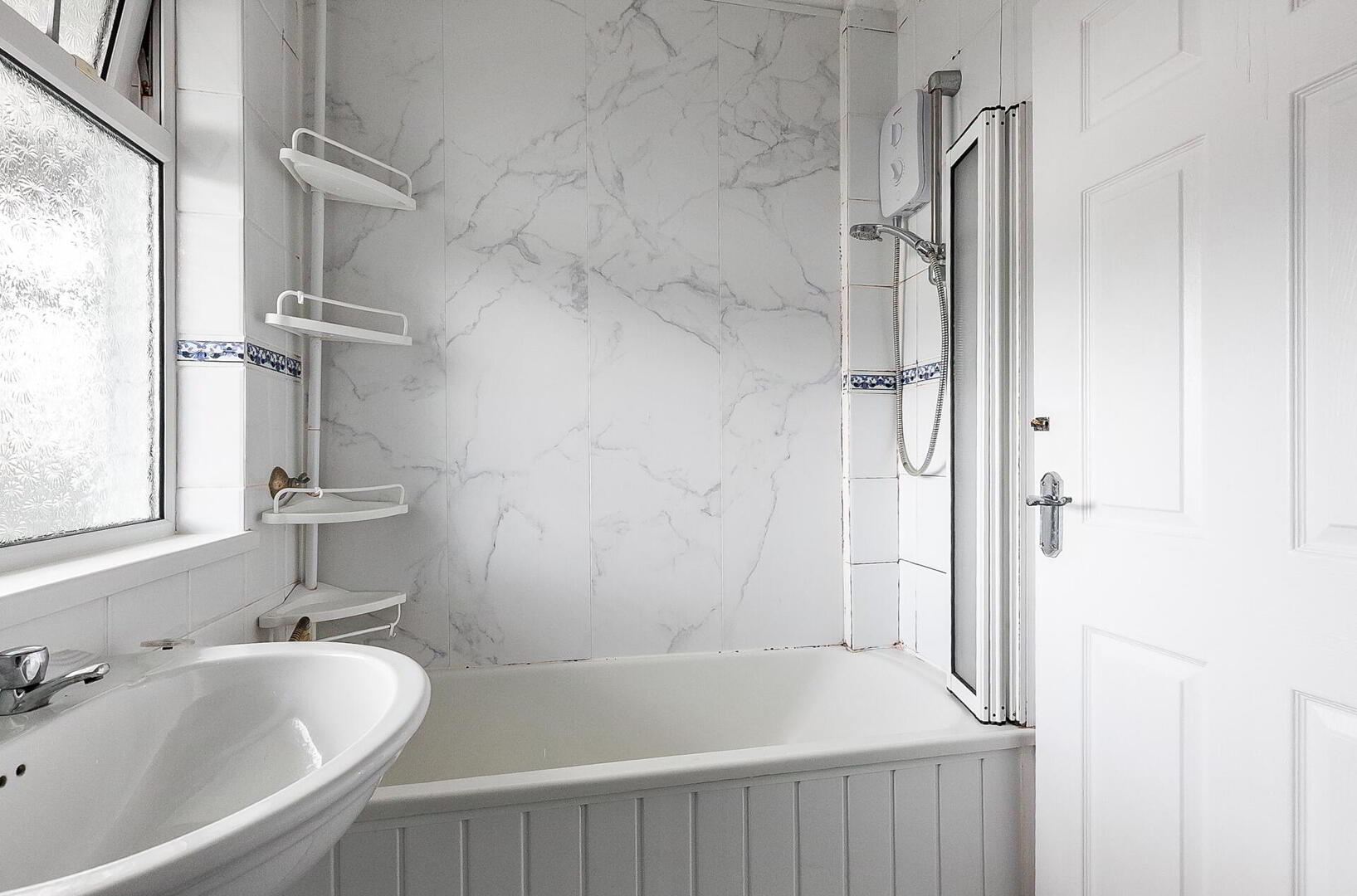 BATHROOM Panel bath with electric shower over, pedestal wash hand basin with chrome taps, low flush w.c, partly tiled walls, tiled floor.