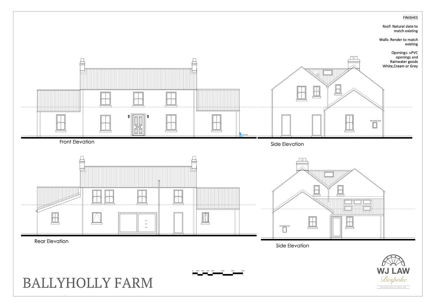 Roof: Concrete interlocking roof tiles - blue black with matching ridge tiles. Bangor blue slates available on request.