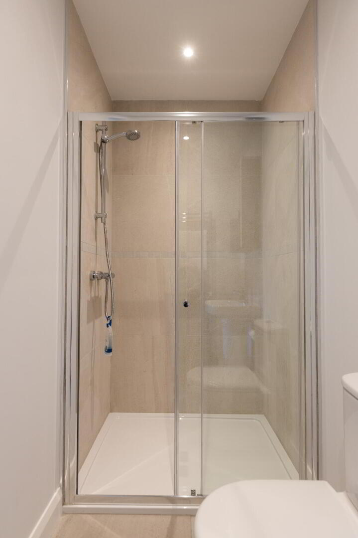 ENSUITE Suite comprising of enclosed shower cubicle, low flush WC, pedestal wash hand basin, stainless steel towel radiator, tiled splashback, tiled floor, extractor fan, recessed low voltage spotlights.