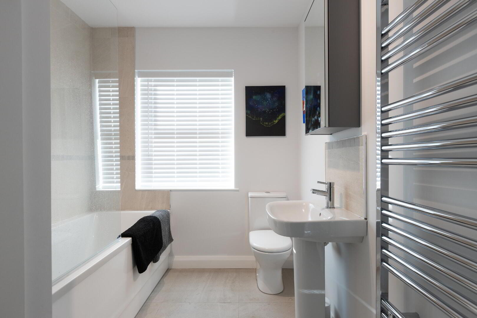 BATHROOM Suite comprising of a panelled bath with Mira shower unit, low flush WC, pedestal wash hand basin, tiled splashback, tiled floor, stainless steel towel radiator, storage cupboard.