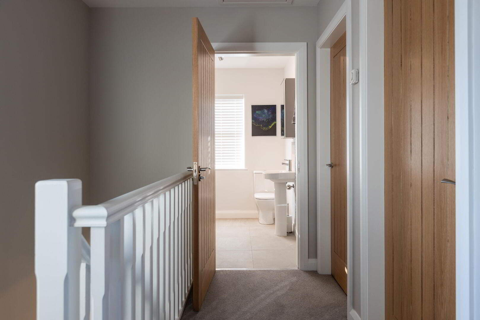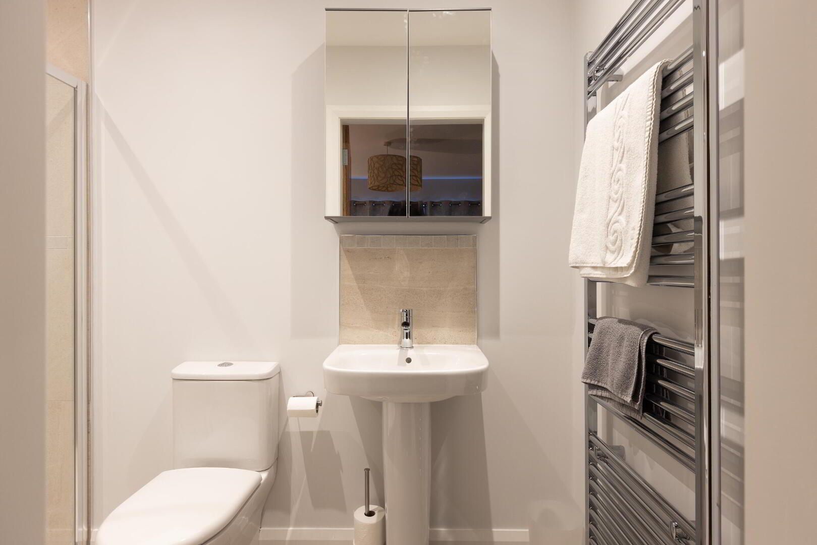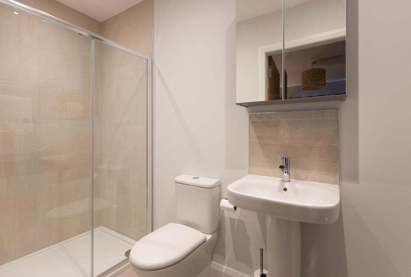 ENSUITE Suite comprising of enclosed shower cubicle, low flush WC, pedestal wash hand basin, stainless steel towel radiator, tiled splashback, tiled floor, extractor fan, recessed low voltage spotlights.